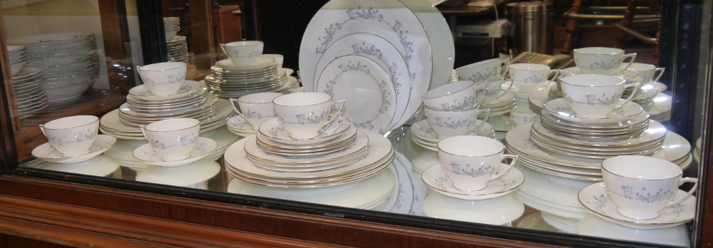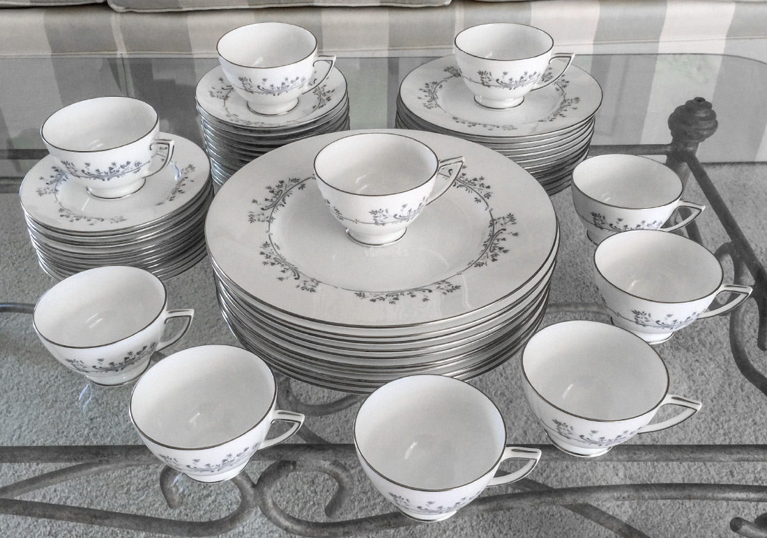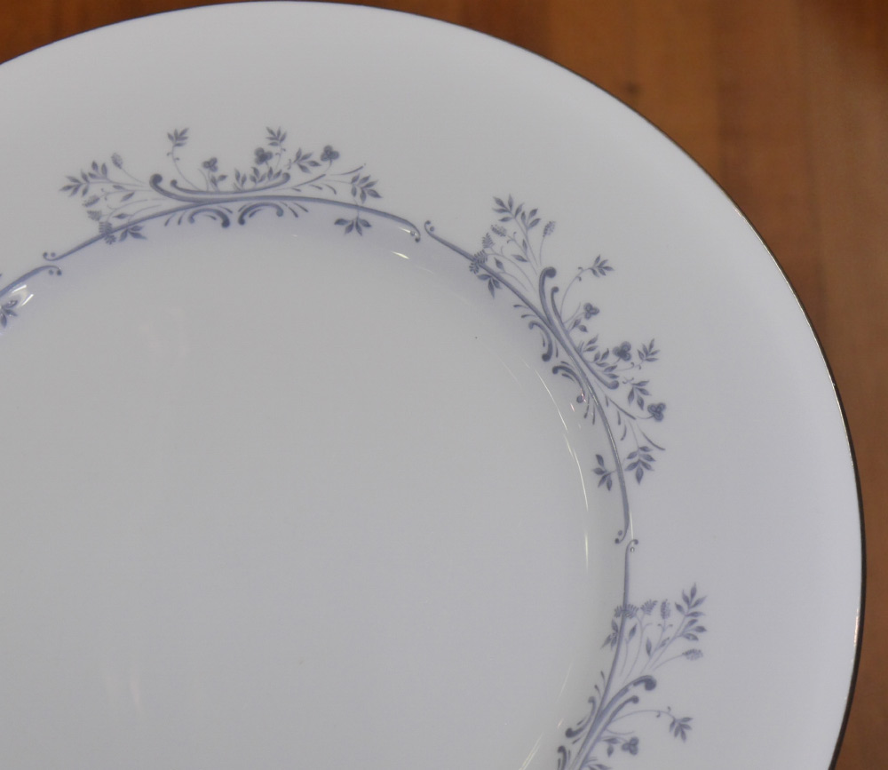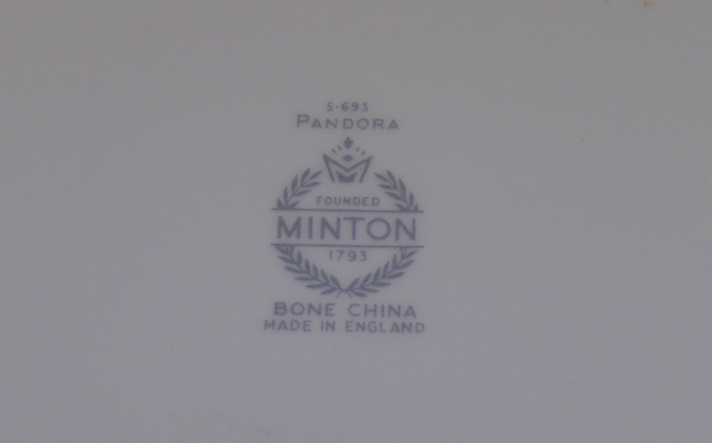 MINTON PANDORA FINE CHINA: Platinum rim, approx. 54 pieces to include 10 dinner plates (10 1/2''), 12 salad plates, 12 bread plates, 10 cups and 10 saucers.