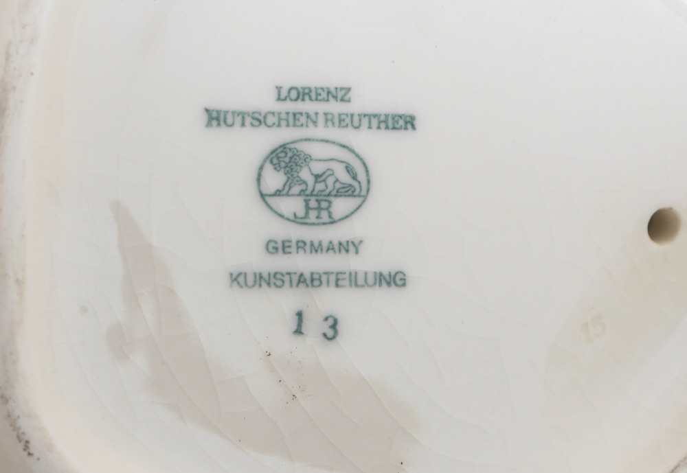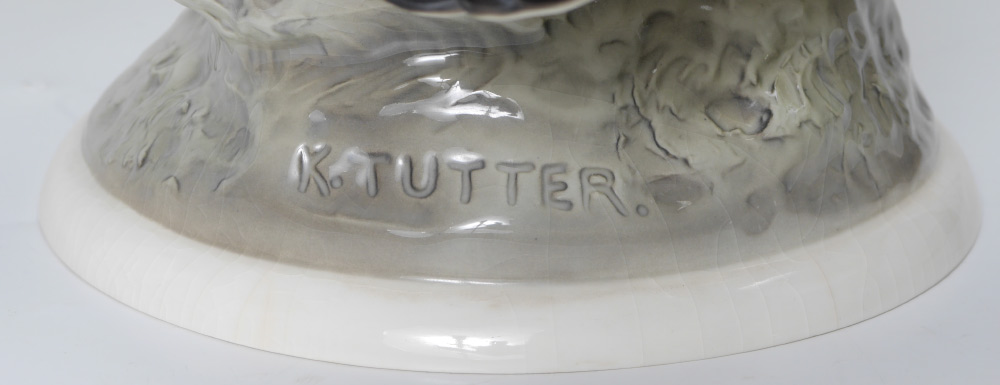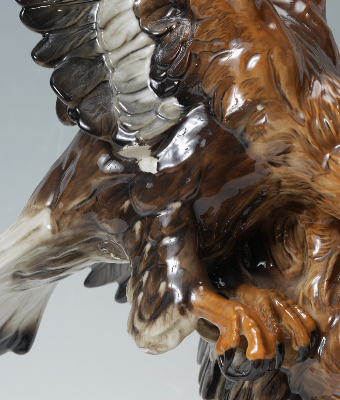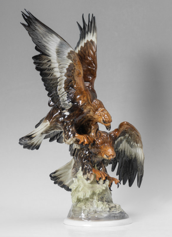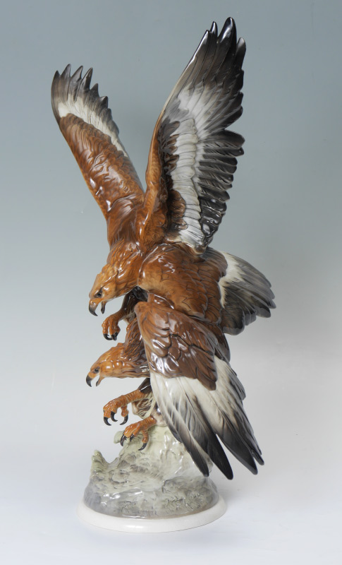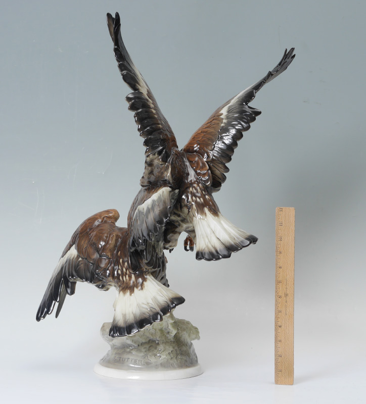 LARGE HUTSCHENREUTHER DOUBLE EAGLE SCULPTURE: Grouping of 2 porcelain eagles impressed near base with artist name K. Tutter, marked ''Lorenz Hutschenreuther Germany Kunstabteilung 13''. Overall measures approx. 25 1/2'' h. x 17'' x 13 1/2''.