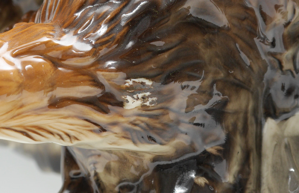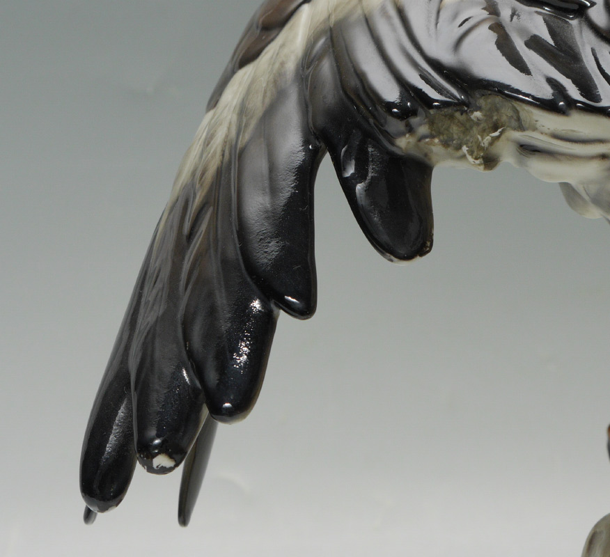 CONDITION: One wing feather on lower bird with small chip, factory support bar removal spot under wing and blemish to chest of upper bird, general crazing.