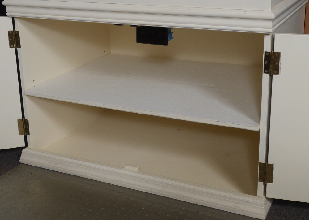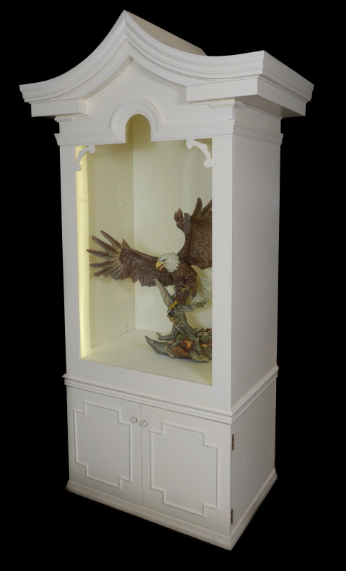 LARGE LIGHTED CUSTOM DISPLAY: Custom crafted for the Boehm Eagle, removable glass front, 2 door storage underneath, 91'' h., 36'' w., 25'' d.