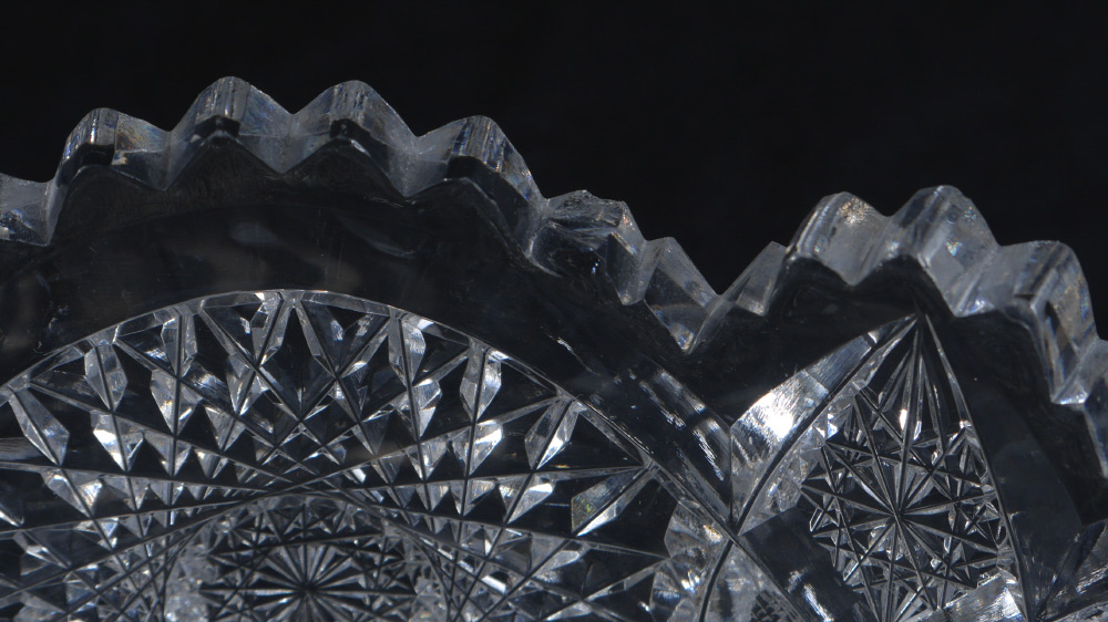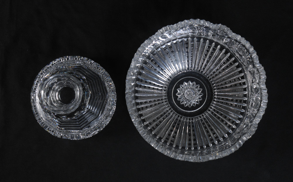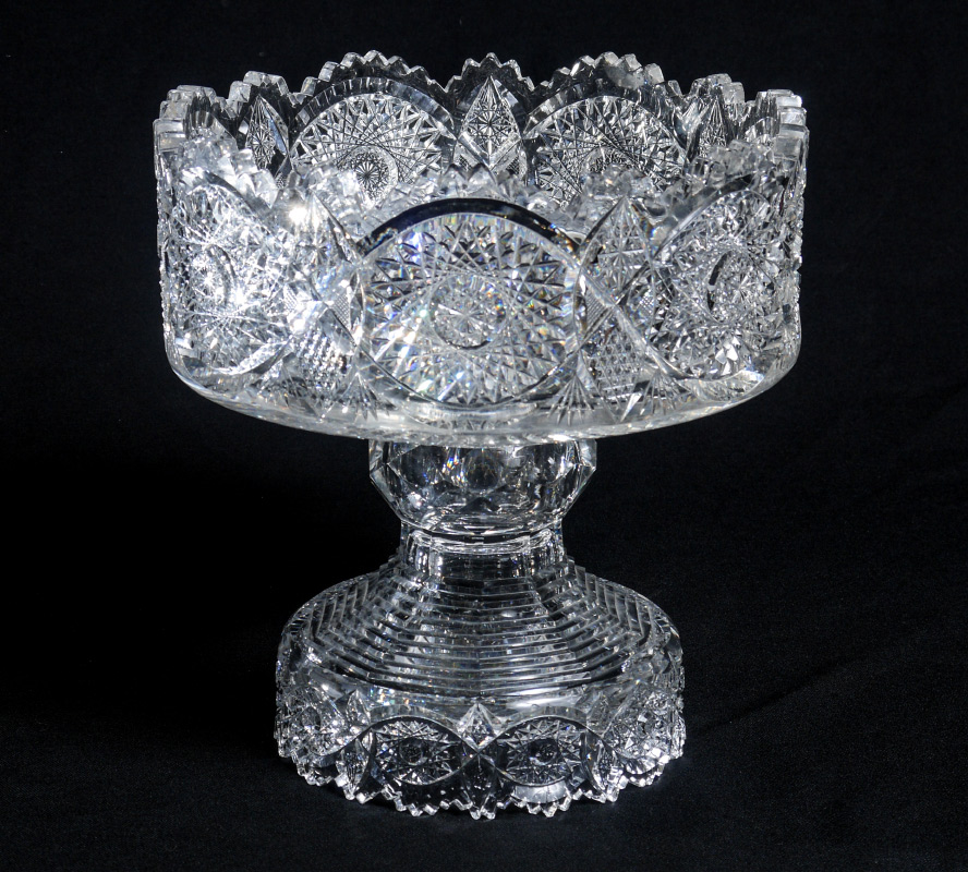 AMERICAN BRILLIANT PERIOD CUT GLASS PUNCH BOWL: 2 parts, base and bowl. Cuts include strawberry and zipper. The base is step cut. Measures approx. 10'' dia. x 10 1/2'' tall.