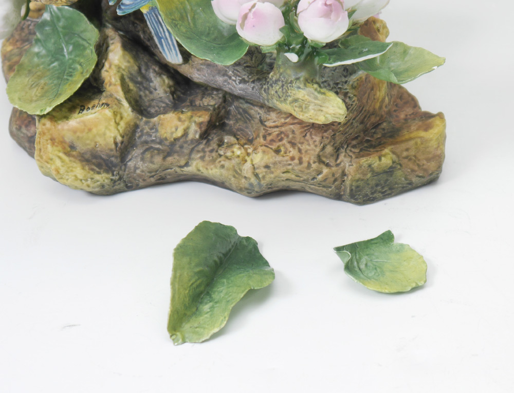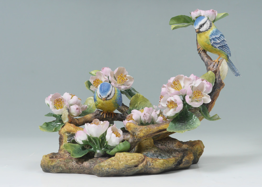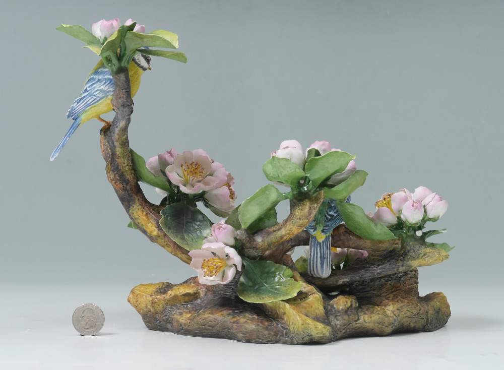 BOEHM PORCELAIN FIGURAL GROUP: 2 birds in blossom filled branches. Boehm Made in England Limited Edition stamp to underside. Measures approx. 9'' x 12'' x 7''.