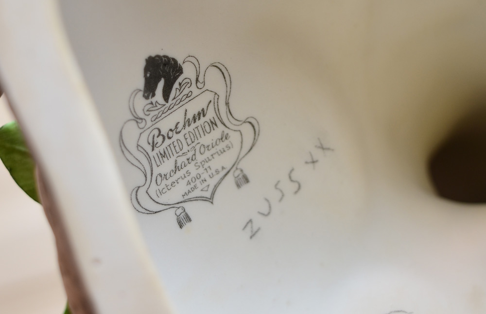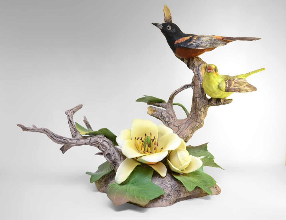 BOEHM PORCELAIN BIRD FIGURAL GROUP ORCHARD ORIOLE: Limited Edition. Made in USA, approx. 10''h. x 15''