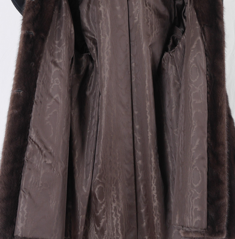 RANCH MINK SWING STYLE FUR COAT WITH COLLAR: Bell style sleeves, velvet lined side slit pockets. Measures approx. 35'' collar to hem, 18'' shoulder to shoulder and 22'' shoulder to cuff.