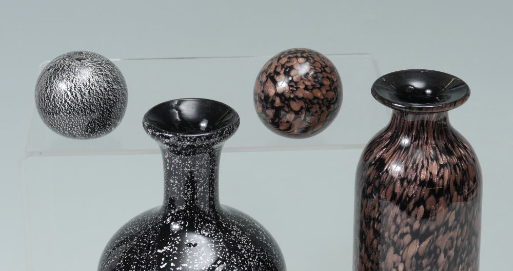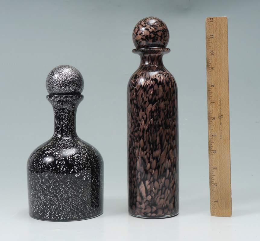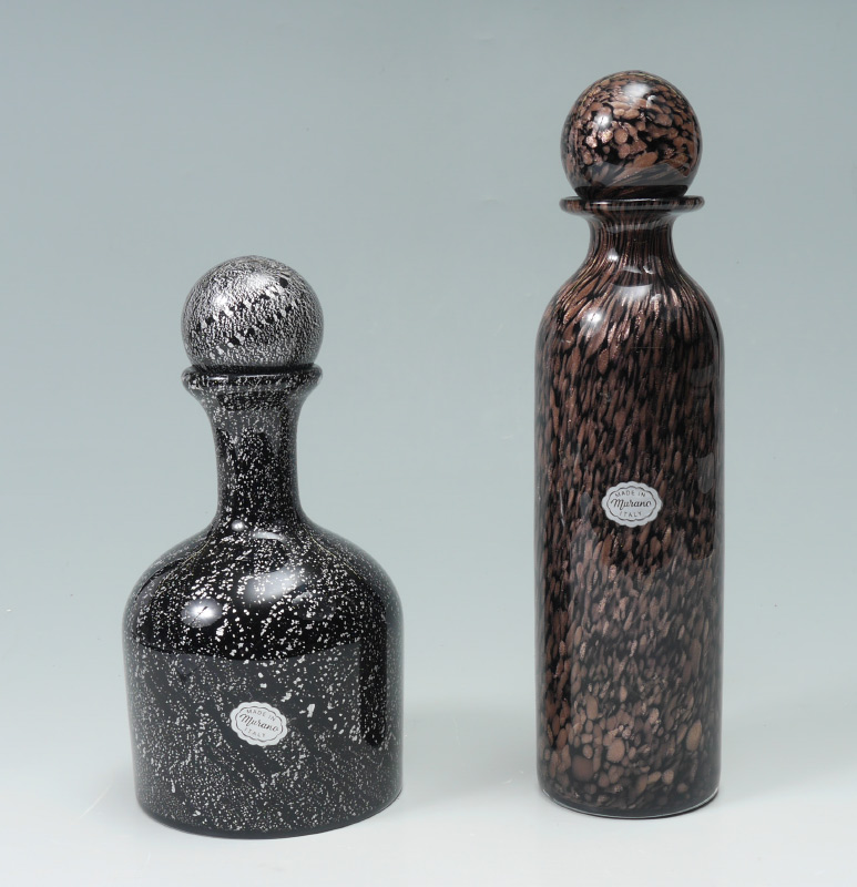 MURANO GLASS DECANTERS: Two decanters with ball stoppers and silver foil sticker labels. Short squat bottle decanter of black glass with silver speckles throughout, flat bottom no visible pontil. And a tall bottle decanter of black glass with copper aventurine throughout, rough polished pontil to base. Overall 12.25''h. with stopper. Sold as a lot.