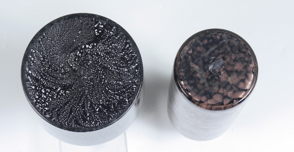CONDITION: Squat - stopper ball has tiny ding with corresponding scratch. Tall - small ding to flared top, very tiny flea bite to stopper.