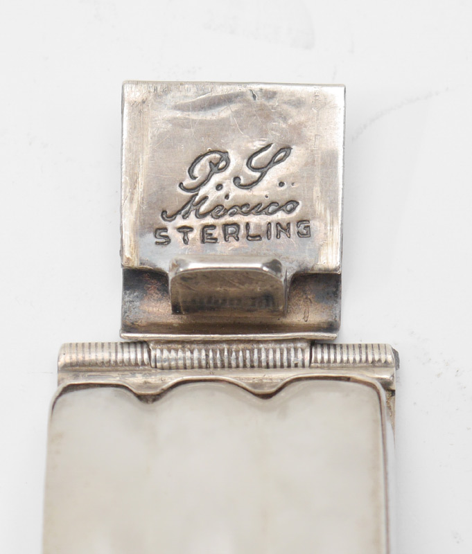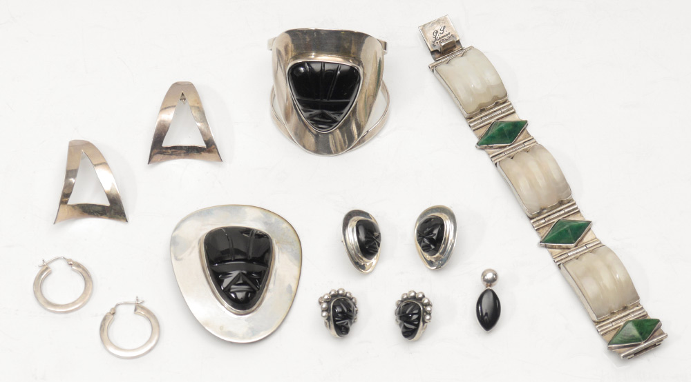 MEXICAN STERLING SILVER JEWELRY: Lot features a 3 piece Sterling and Carved Onyx suite of cuff bracelet 2.5'' interior approx. 2'' x 1 3/8'', brooch 2.75'' x 2.25'' and pierced earrings 1.125'' x 1'', simply marked Sterling. Sterling panel bracelet set with carved green and white stones, marked with cursive P.L. Mexico Sterling, 7''l. Curved open triangle pierced earrings marked TV-68 Mexico 925, 1.5'' x 1.25''. Carved Onyx and Sterling screw back earrings, .87''. Sold with a pair of silver hoops, illegible mark, 1''; single Sterling and onyx earring, 1''.