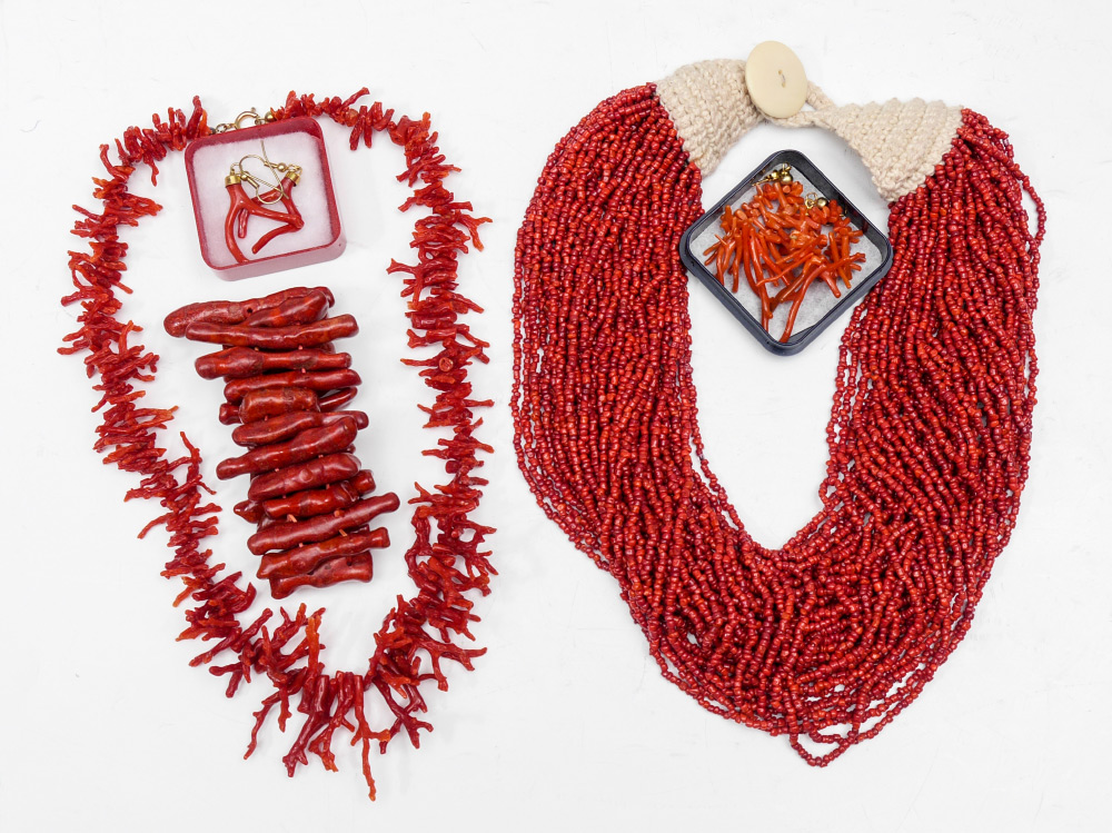 COLLECTION OF RED CORAL JEWELRY: To include 1) Multi strand beaded necklace, 19 1/2'' long. 2) Necklace, 18'' long. 3) Bracelet with elastic bands, 2 1/4''. 4-5) 2 pairs of earrings.