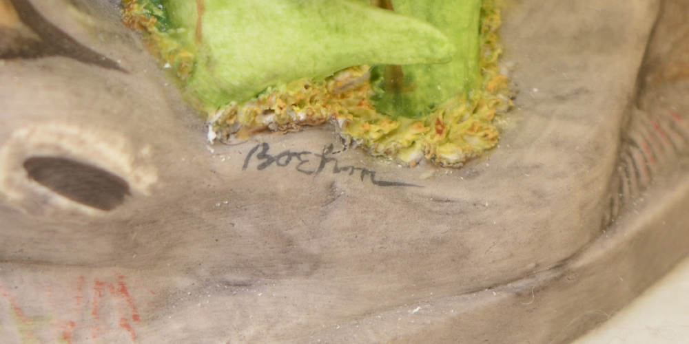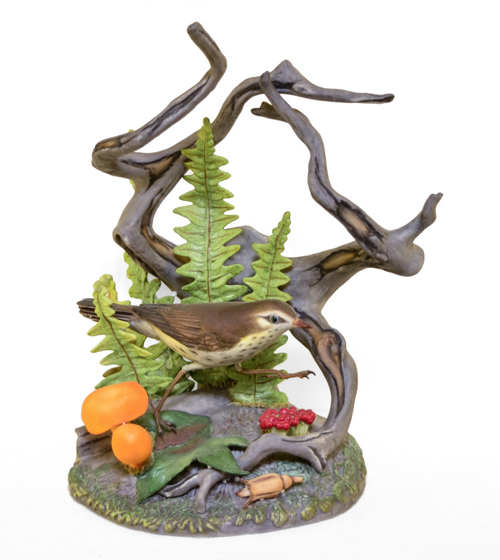 BOEHM PORCELAIN NORTHERN WATER THRUSH BIRD: Resting among the ferns and mushrooms. Made in USA, measures approx. 10 1/2'' x 8 1/4''.