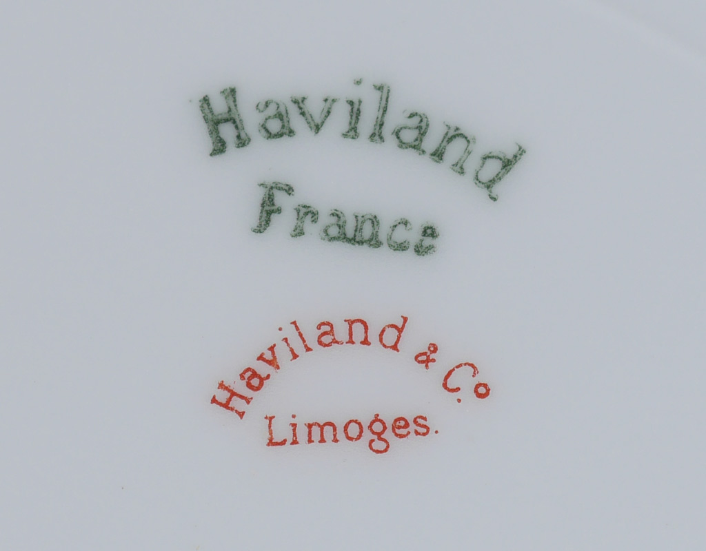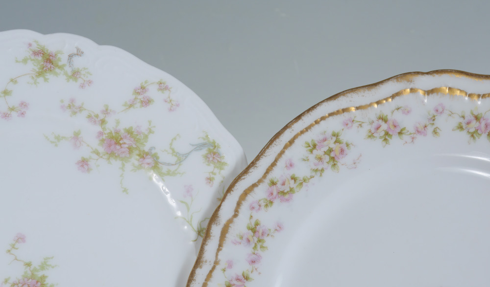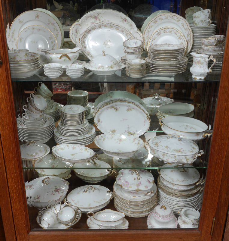 FRENCH HAVILAND LIMOGES FINE CHINA: Early 1900's Haviland. An accumulated, approx. 193 piece, collection in three rose decorated patterns to include 27 dinner plates (9 1/2''), 13 salad plates (7 1/2-8 1/2''), 14 bread plates, 15 soup bowls, 16 dessert bowls, 19 cups, 35 saucers, 5 ramekins with 6 saucers, 23 butter pats, 2 dome top butter dishes with inserts, 1 trivet, 2 relish dishes, 1 creamer, 2 sugar, 4 open vegetable bowls, 2 tureens, 3 covered vegetable, and 5 platters (11 3/4'' - 14').
