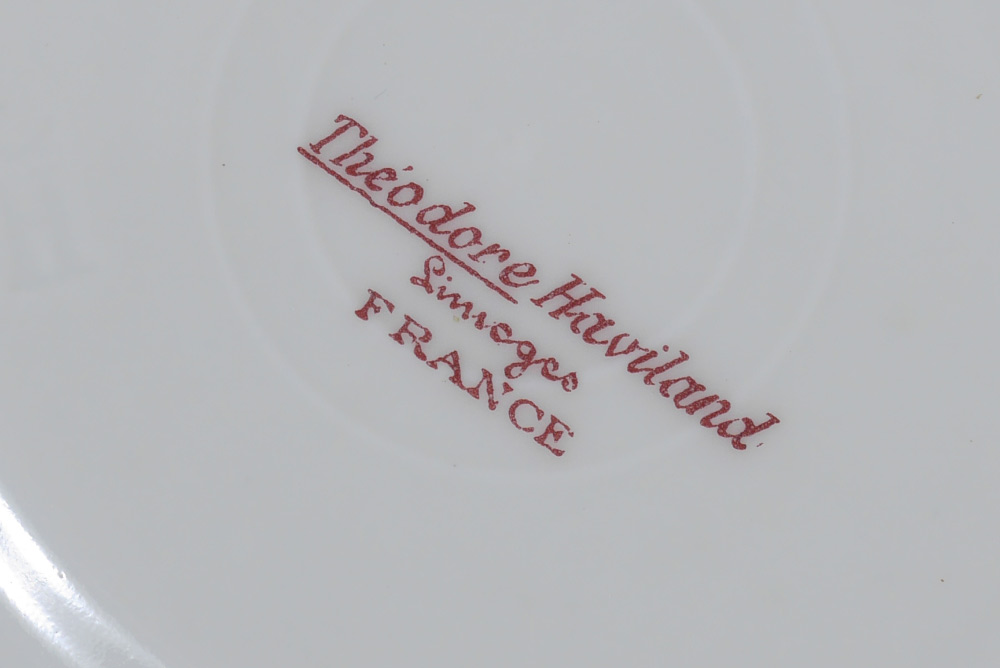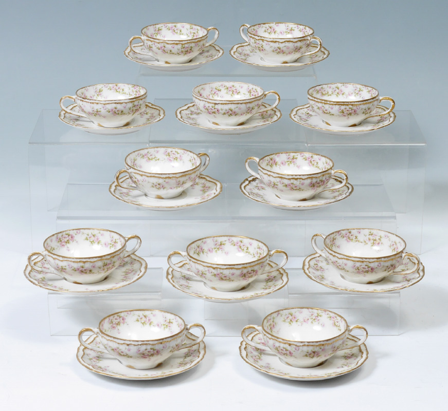 SET OF 12 FRENCH HAVILAND LIMOGES BOUILLON CUPS AND SAUCERS: Theodore Haviland, Ca. 1904-1920's. Rose decorated. 9 bouillon cups and 3 tea cups. Saucer measures 5 1/2'' dia.