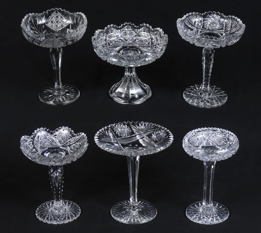 GROUP OF 6 AMERICAN BRILLIANT CUT GLASS COMPOTES: Elegant long stem compotes, measure approx. 8''-9'' tall.