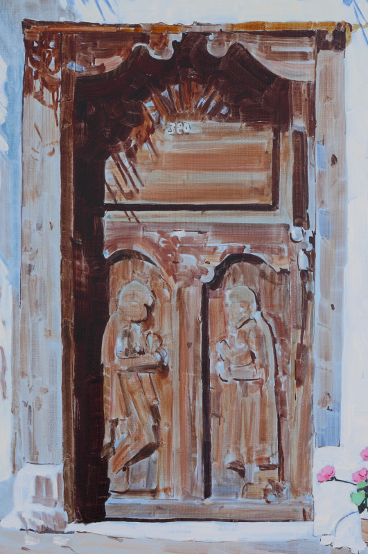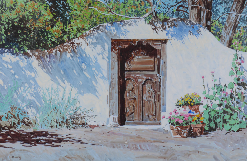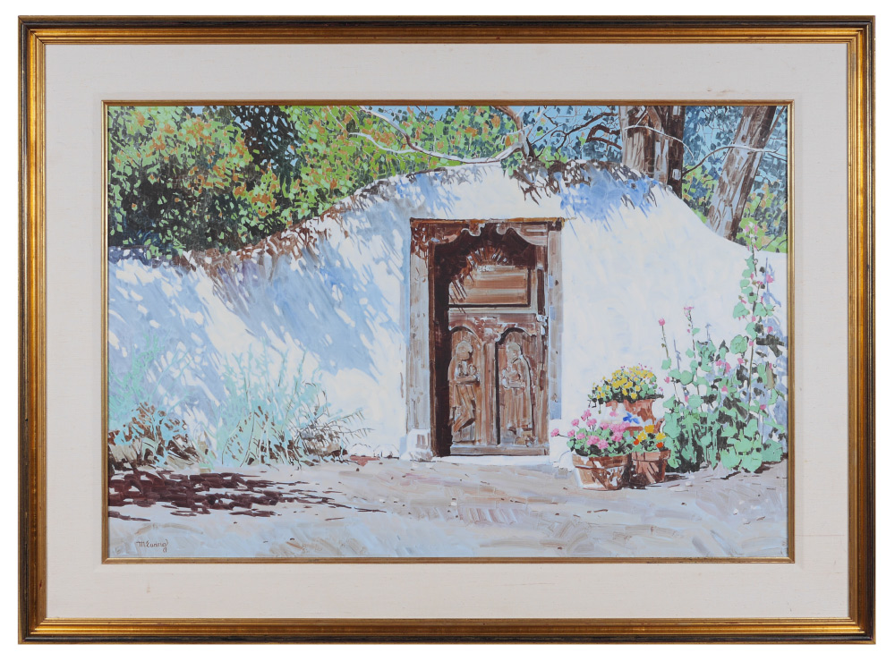 EWING, Michael, (American, 1951-): Doorway Scene, ''Bien Recibido'', Oil/Canvas, 24'' x 36'', signed lower left, custom frame, 33'' x 45'', label verso.