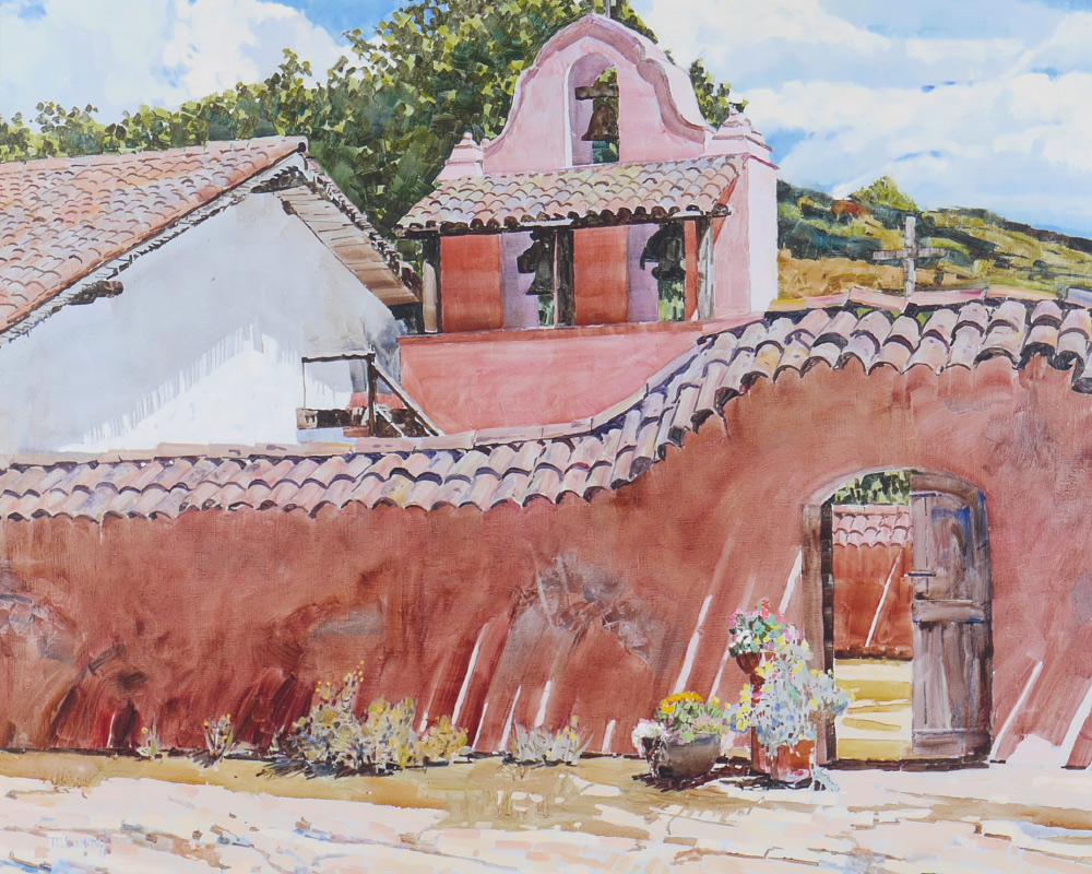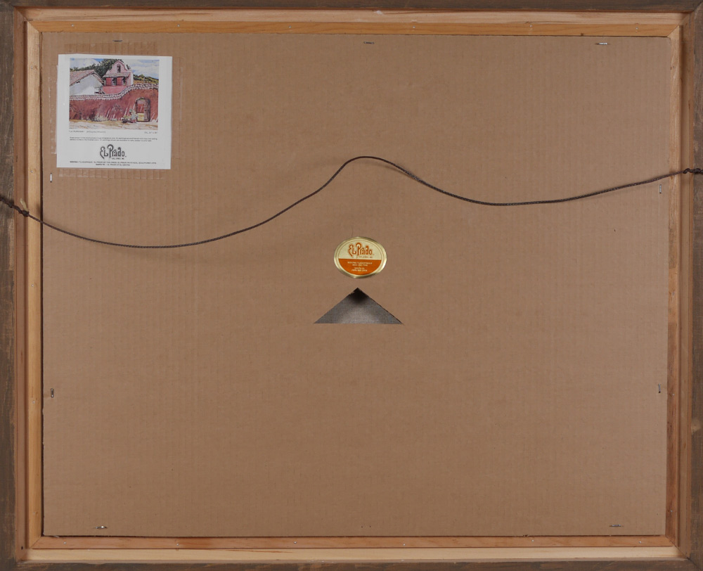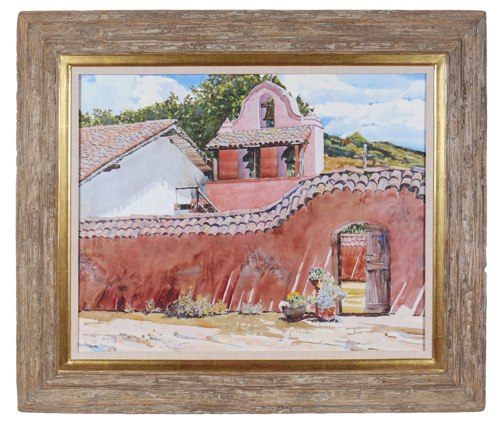 EWING, Michael, (American, 1951-): Doorway Scene, ''La Purisima'', (A Country Mission), Oil/Canvas, 24'' x 30'', signed lower left, custom barnwood frame, 35'' x 41'', El Prado Gallery label verso with photo ad with this painting.
