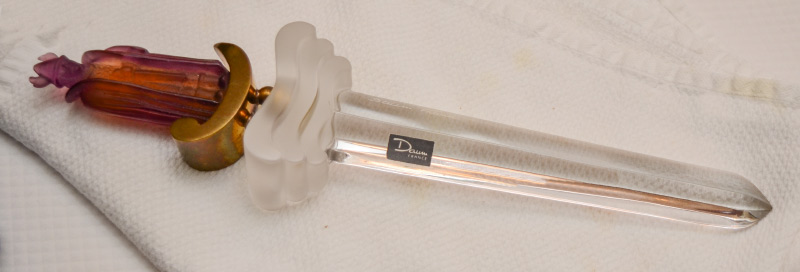 DAUM FIGURAL LETTER OPENER: Figural man in robes in amethyst glass and brass grip with frosted glass guard and clear glass blade. Signed Daum France with original sticker. Measures 11 3/4'' long x 2 5/8'' wide.