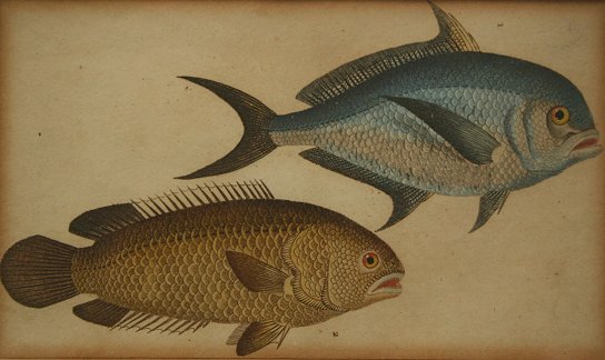 NODDER, Richard P., (British, d 1820): Set of 3 color fish engravings, sight size 4'' x 6 1/4'', encased in period faux grain painted frames with minor wear, 10 1/4'' x 12''.