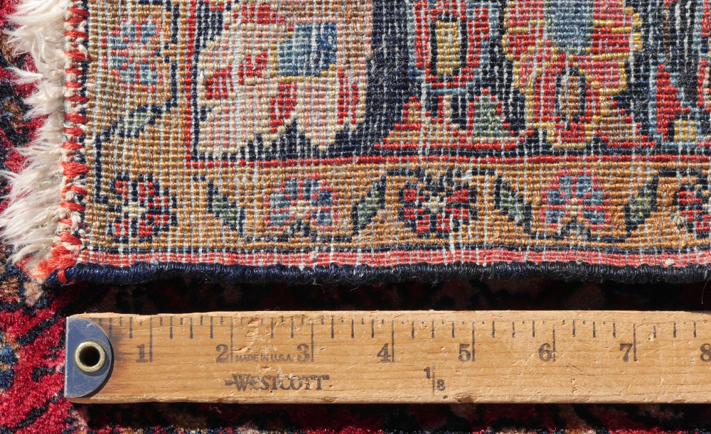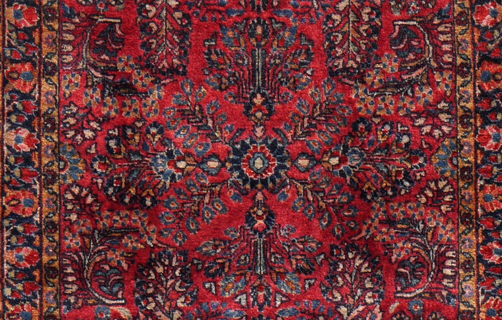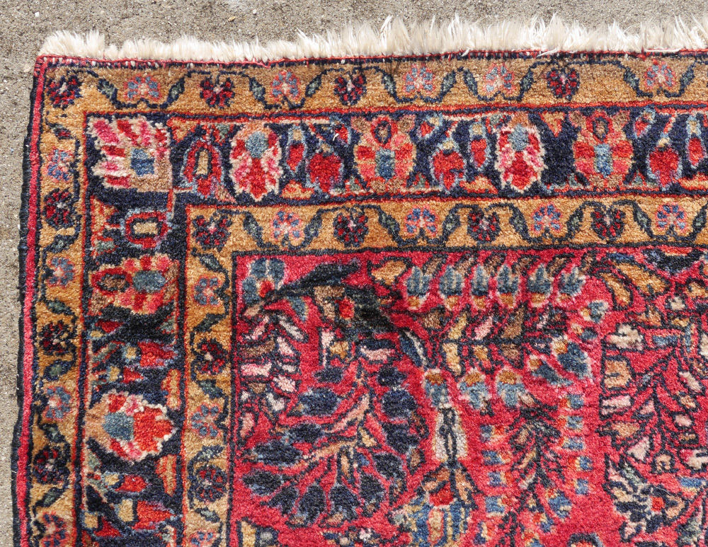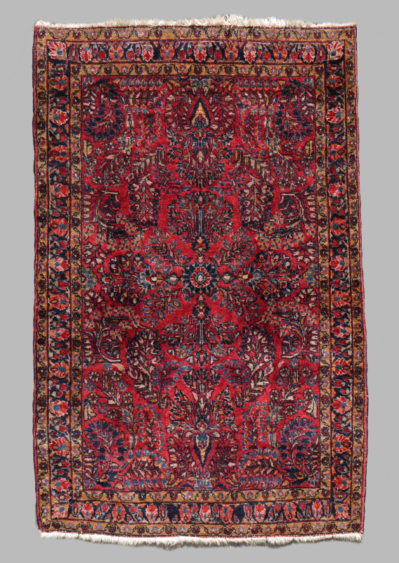 SEMI-ANTIQUE PERSIAN SAROUK HAND KNOTTED WOOL RUG, 3'4'' x 4'10'': This Sarouk has traditional colors and designs. The red field is covered with sprays of various flowers that radiate out from the center of the rug. The two guard borders have a pale gold ground and the main border has a deep blue ground. Condition is good except the fringe is worn.