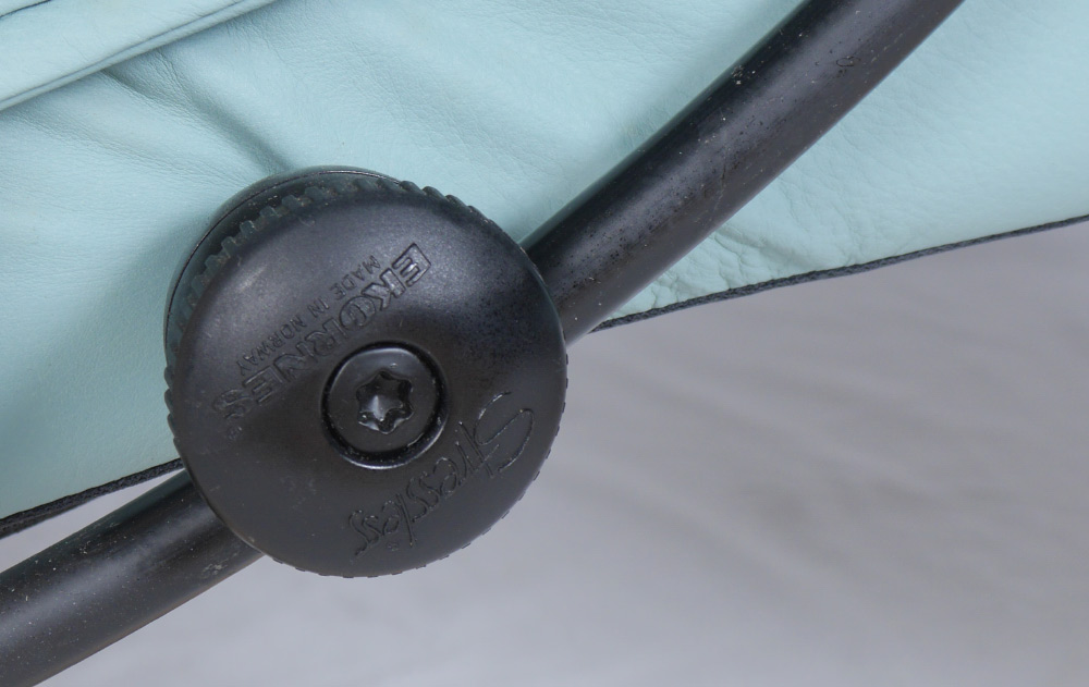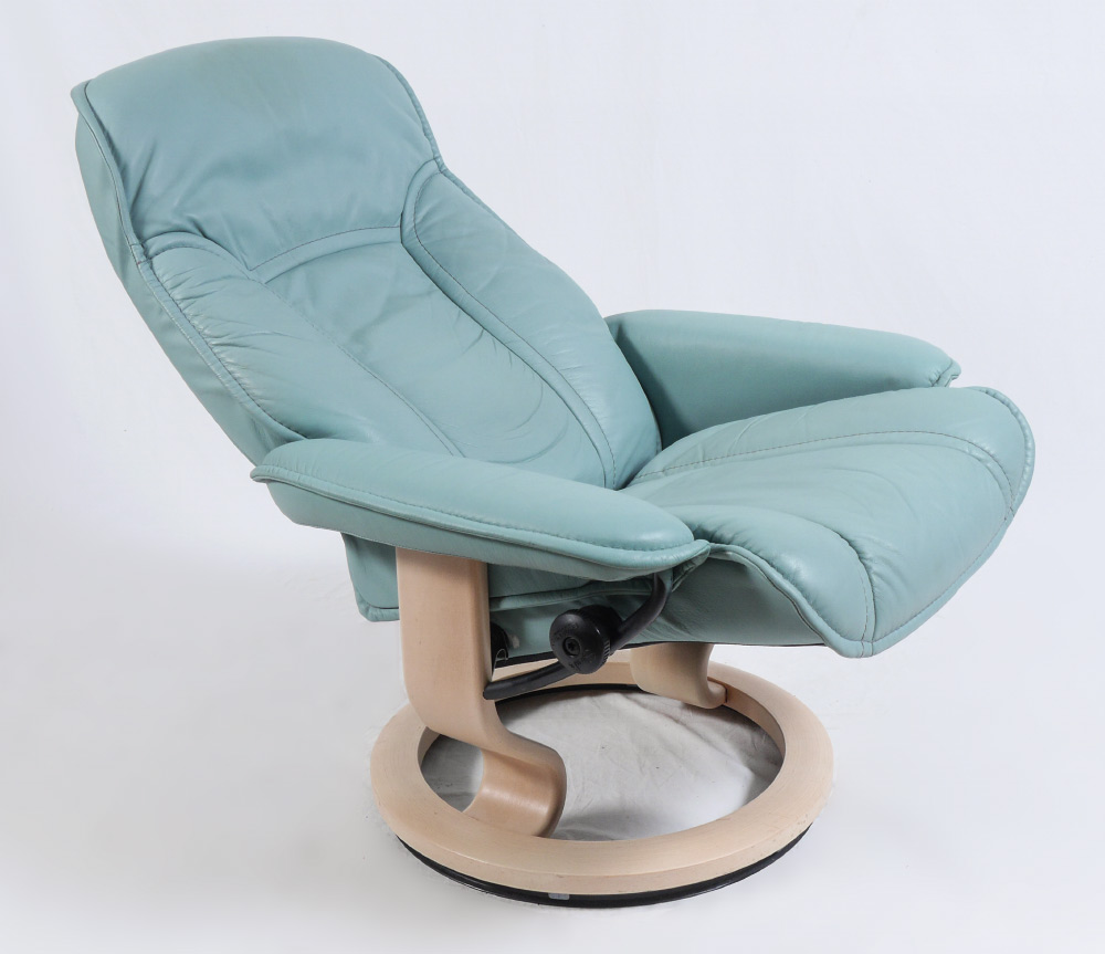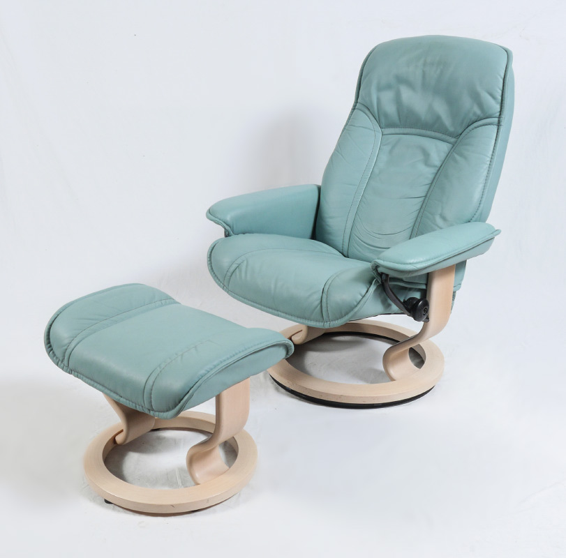 EKORNES STRESSLESS CHAIR & OTTOMAN: Turquoise blue leather upholstery, chair marked on knob and measures 40 1/2'' h. x 30 1/4'' x 30''. Sold with the matching ottoman 16'' h. x 20 1/4'' x 17''.
