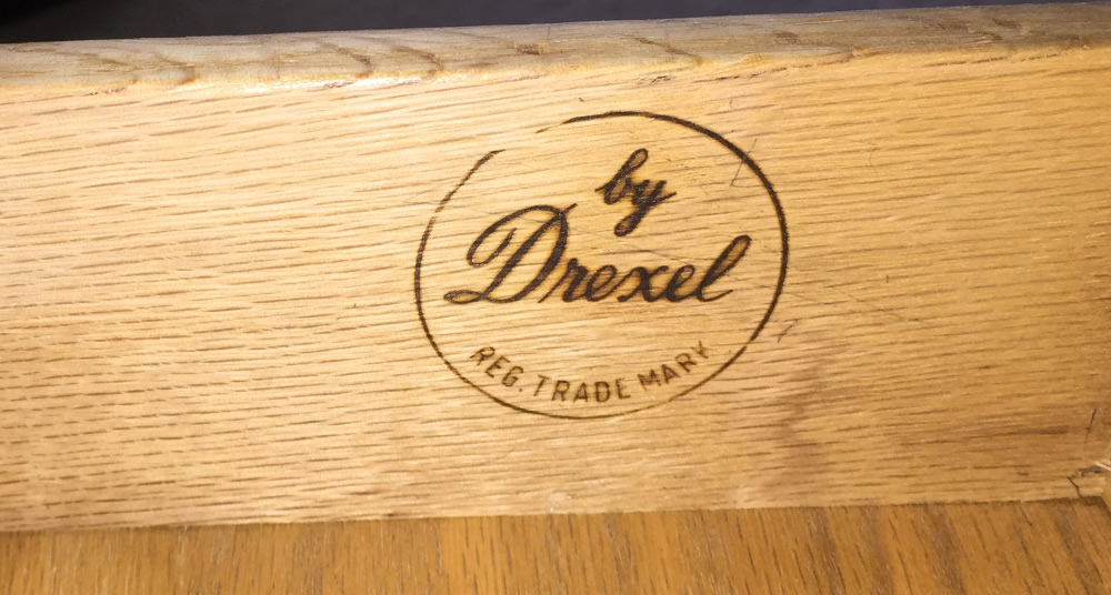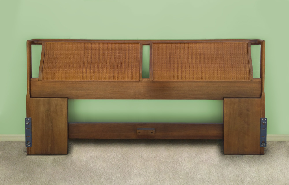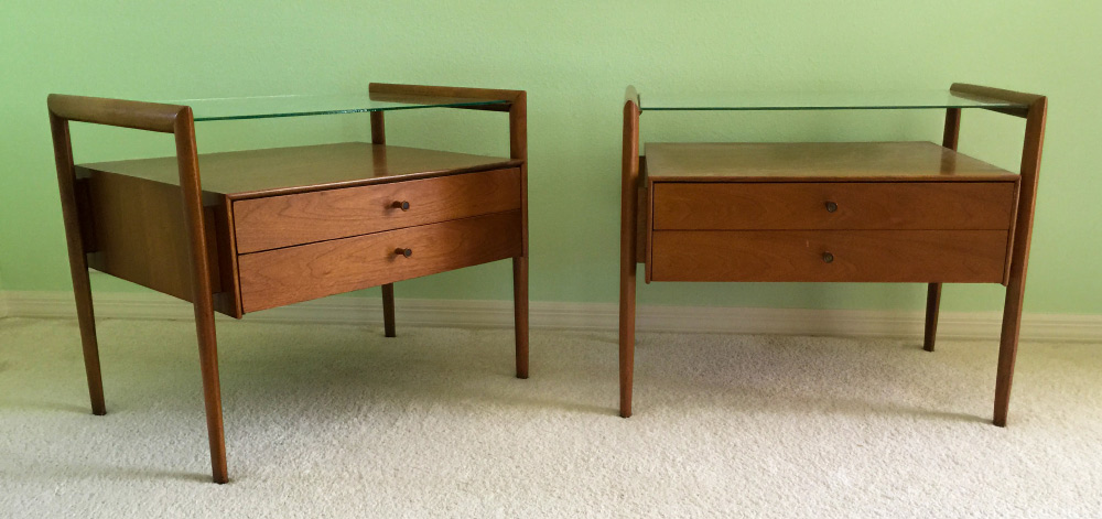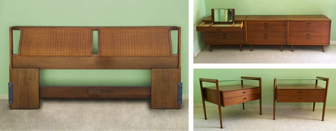 DREXEL PARALLEL WALNUT BEDROOM SET: To include king size bed headboard (36 1/2'' h. x 77 3/4'' x 2 3/4'') and rails, 2 glass top 2 drawer night stands, 3 separate 4 drawer chest of drawers.