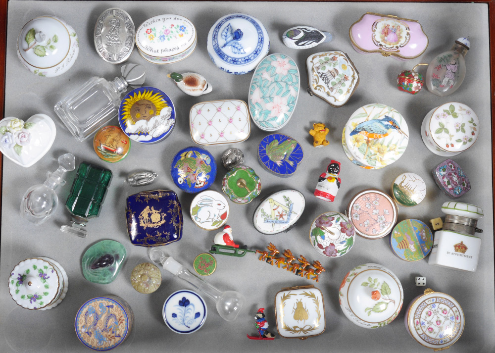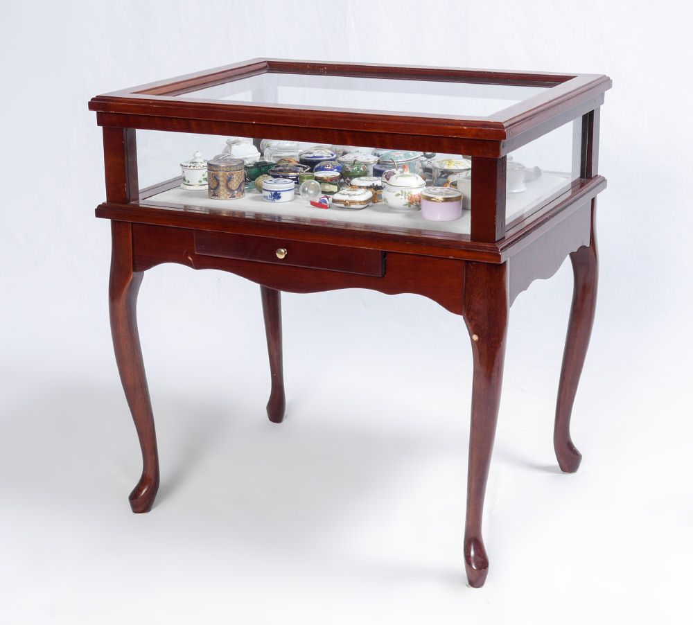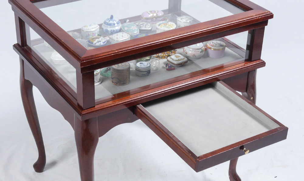 DISPLAY TABLE WITH PILL BOXES: Lift top display side table with glass top and sides, shaped legs. Sold with contents of an assortment of pill boxes, perfumes and chotchkies. Table overall measures 20 1/2'' h. x 22 1/4'' x 17 1/2''.