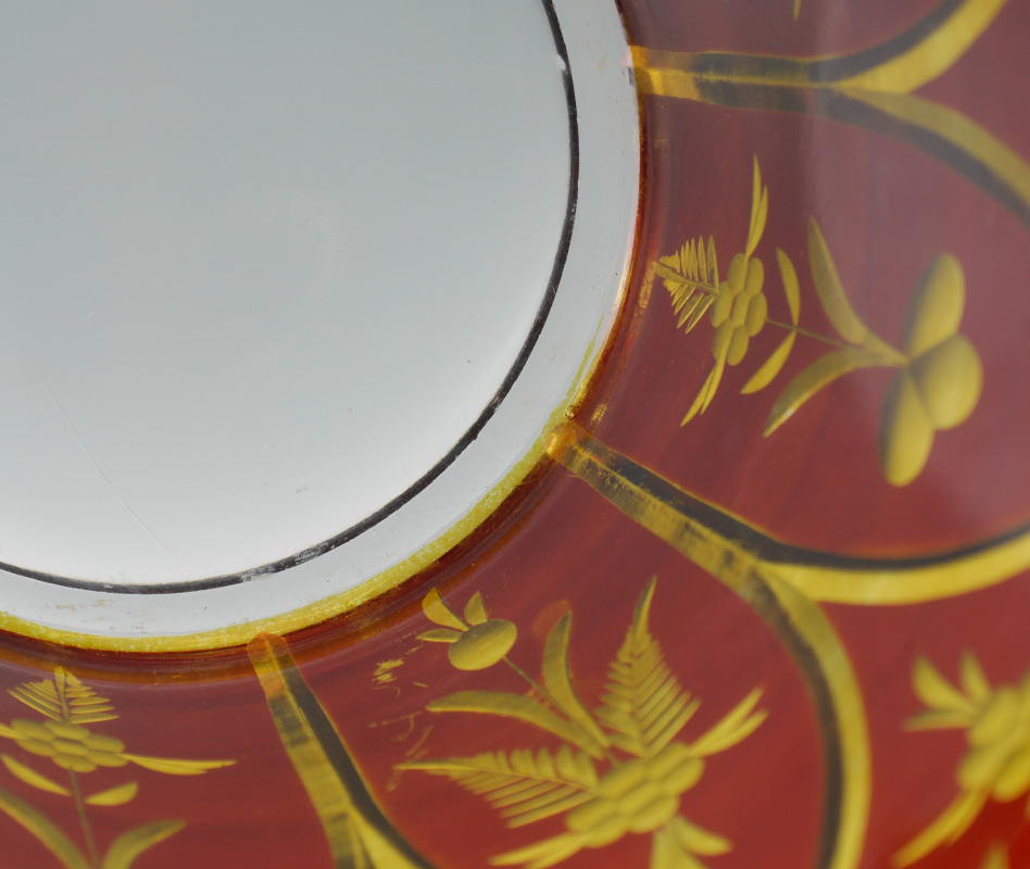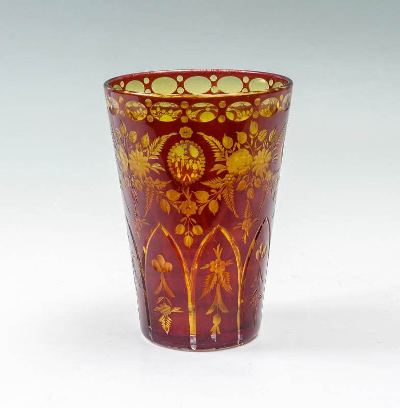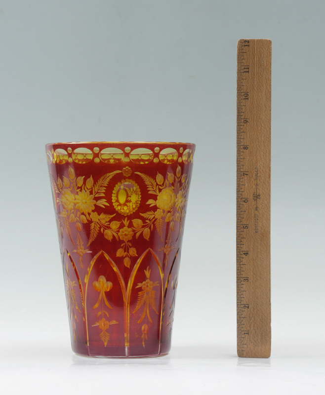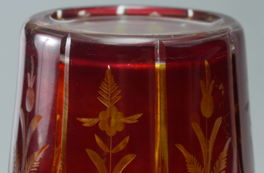 EARLIER BOHEMIAN RUBY CUT TO YELLOW GLASS VASE: Deep blood red cut in a floral & garland design. Measures approx. 8'' tall x 5 3/4'' dia.