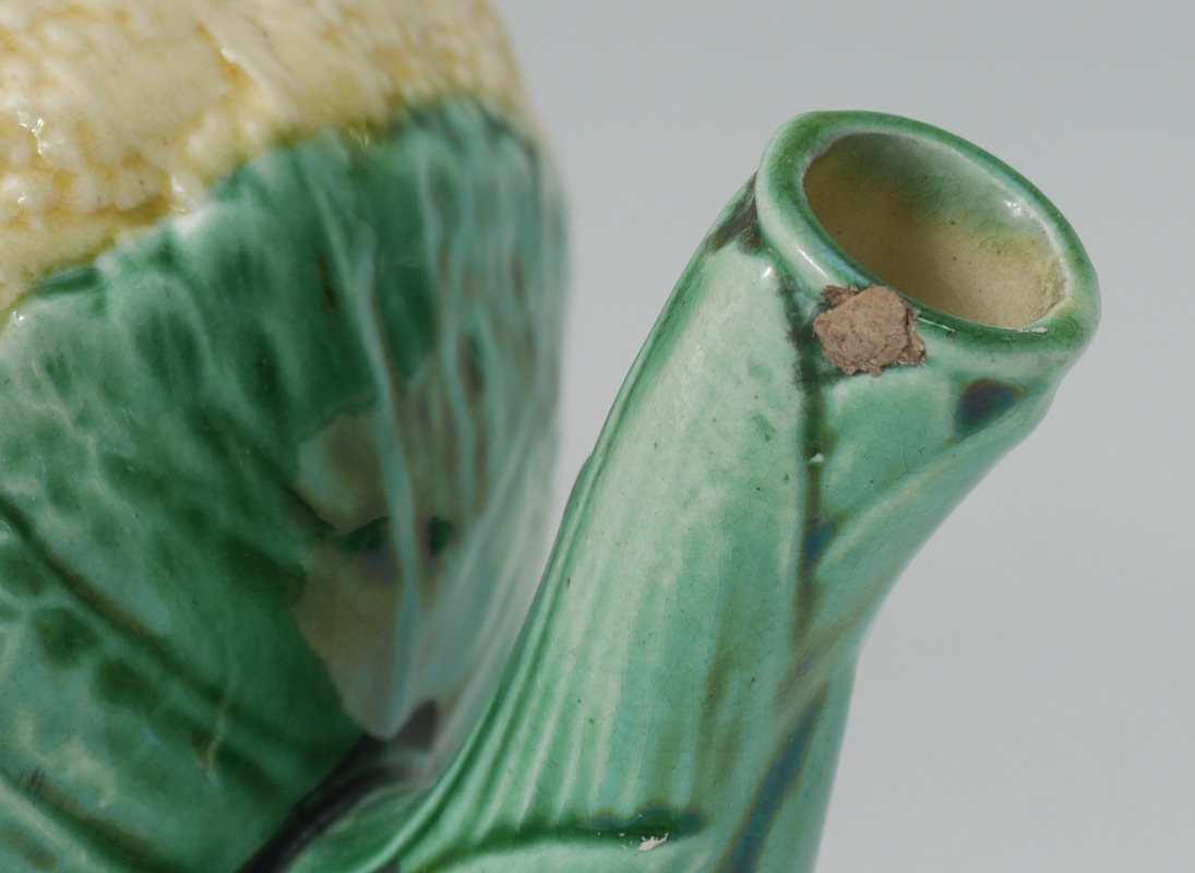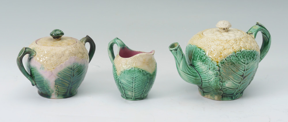 ETRUSCAN MAJOLICA CAULIFLOWER 3 PIECE TEA SET: Phoenixville, Pa. Ca. 1879-1892. Teapot, cream pitcher and covered sugar.