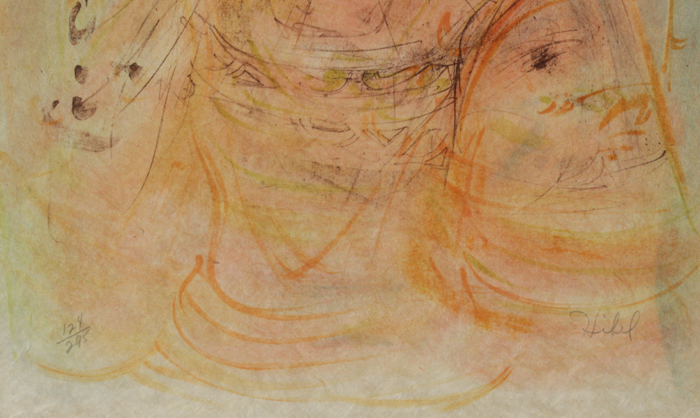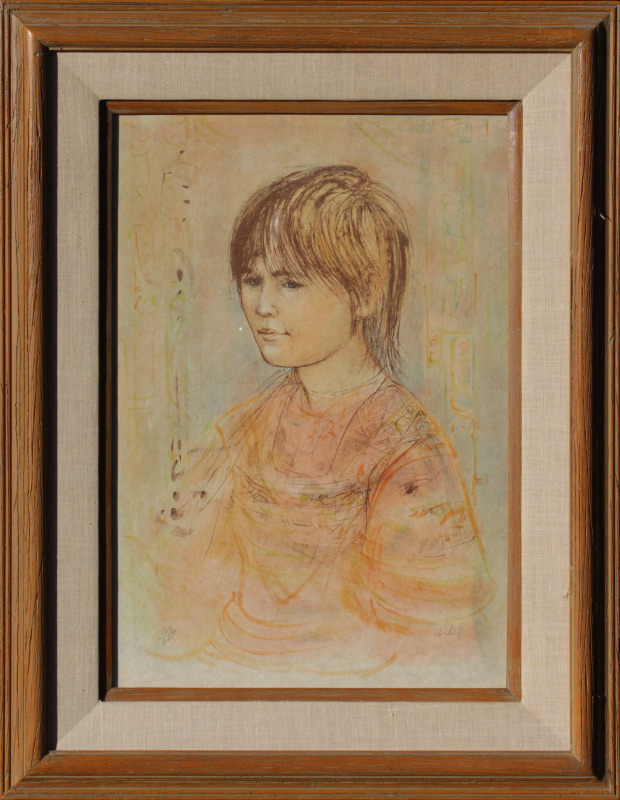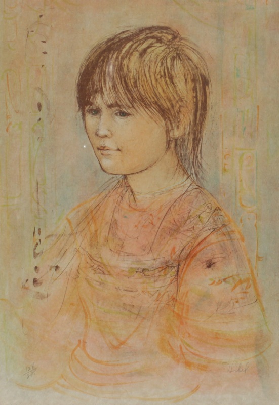 HIBEL, Edna, (American, 1917-): ''Ulla'' portrait of a young girl, Lithograph, sight size 20'' x 13 1/2'', signed and numbered 124/295 on the lower area, matted and framed under glass, 27'' x 21'', Oelschlaeger label verso.