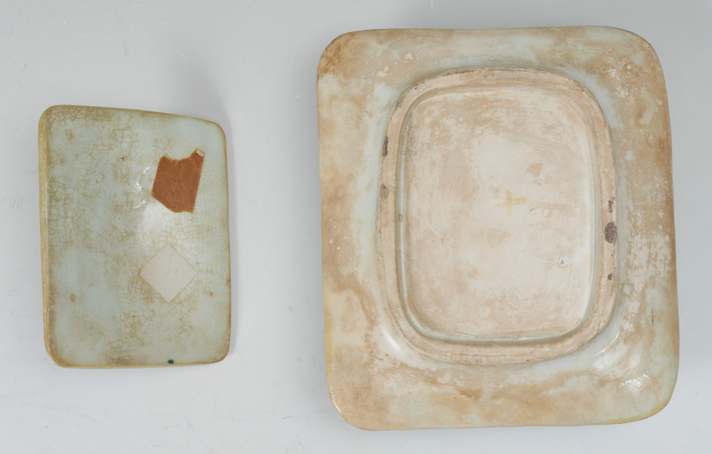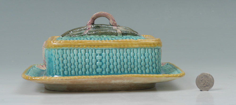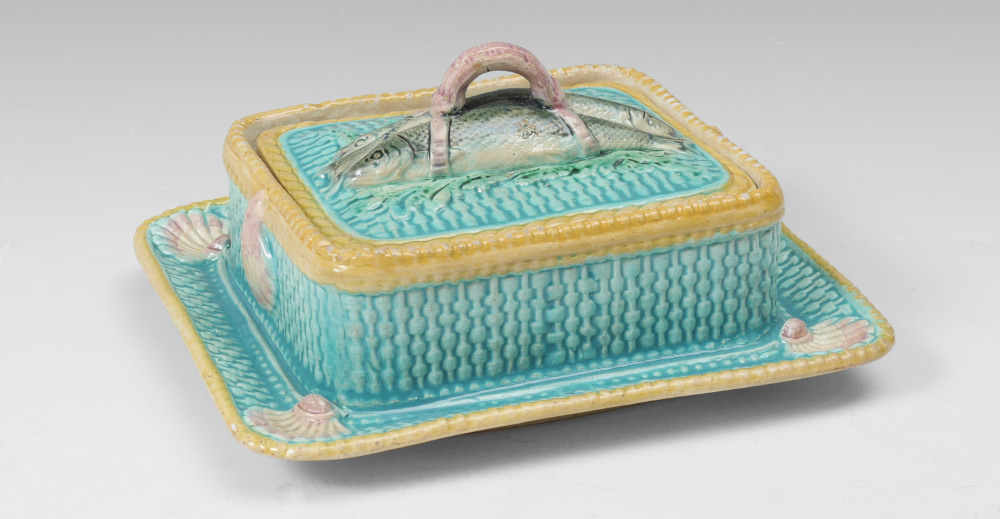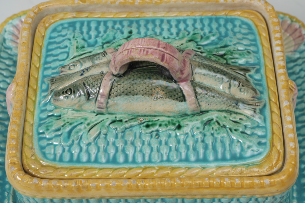 MAJOLICA SARDINE BOX: With the classic sardine figural finial, rich coloration of turquoise basket weave and gold rope trim. Unmarked, measures approx. 4'' tall x 7'' x 8 1/2''.