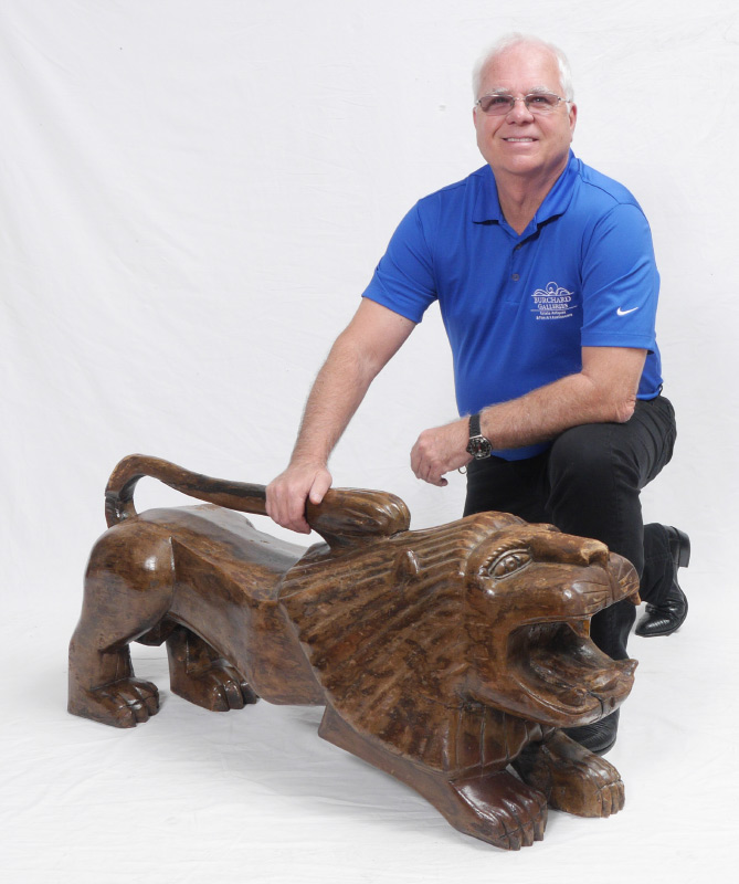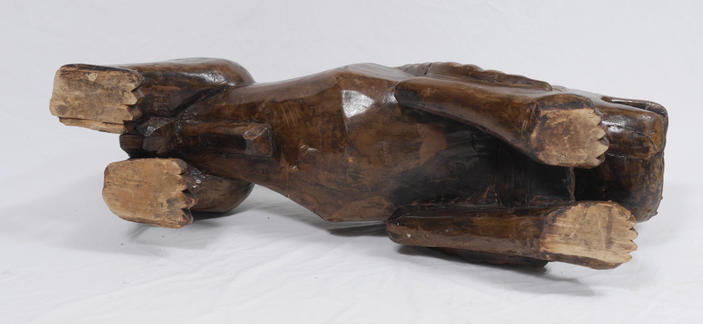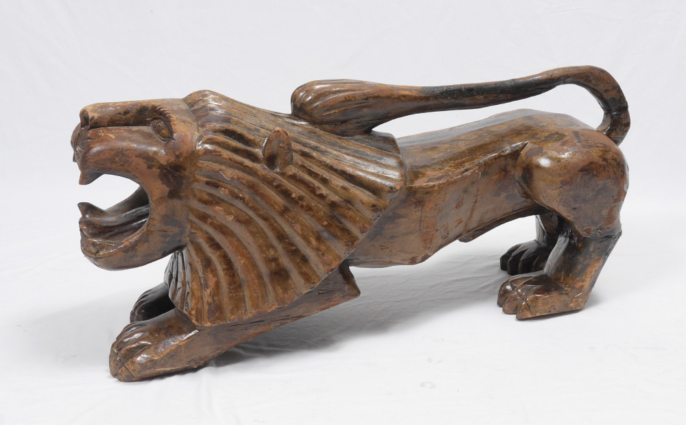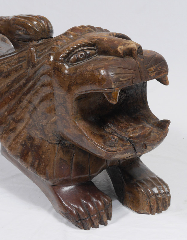 CARVED WOOD LION FIGURE: Stylized crouching lion, overall measures 19 1/2'' h. x 43'' x 13''. Actual age and origin unknown.
