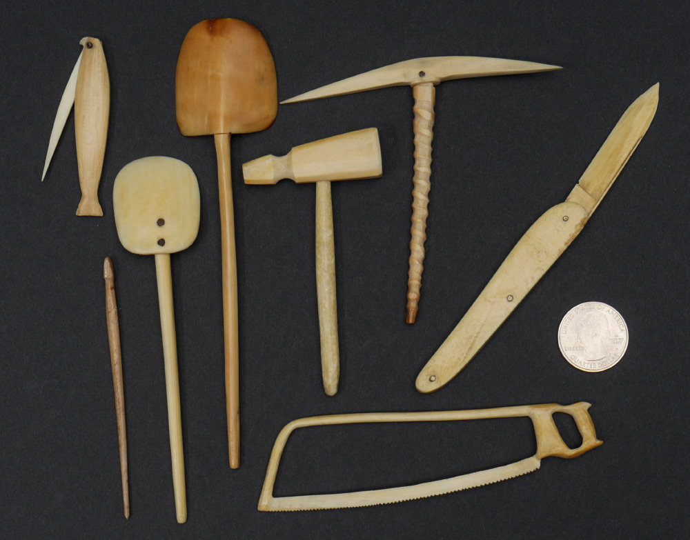 COLLECTION OF WALRUS IVORY TOOLS & KNIVES: An assembled collection to include 2 shovels, hand saw, 2 folding knives, pick and hammer. Handles on pick and hammer do not appear to be ivory. Longest shovel 6''.