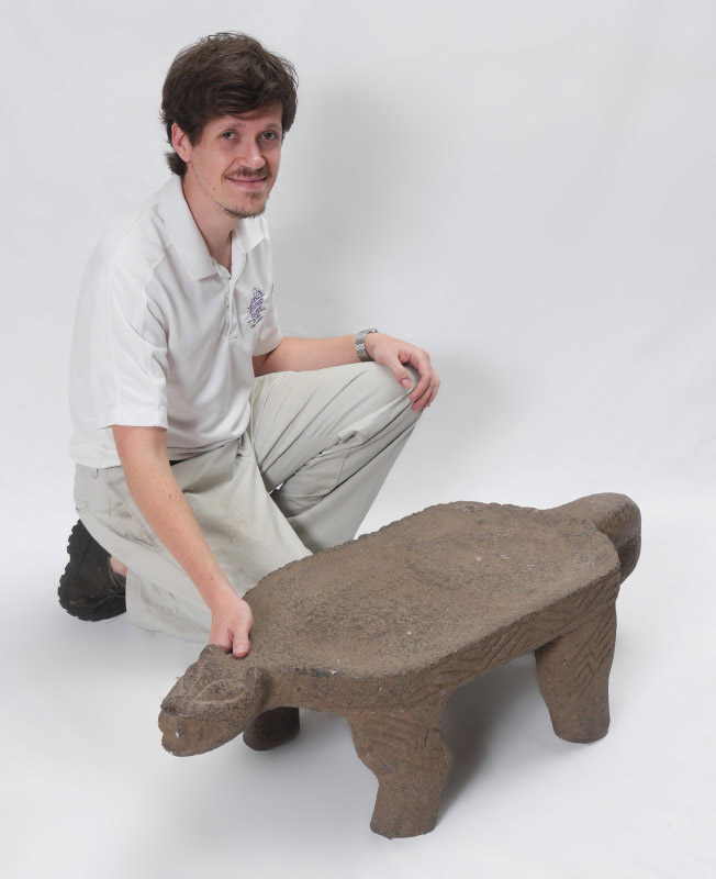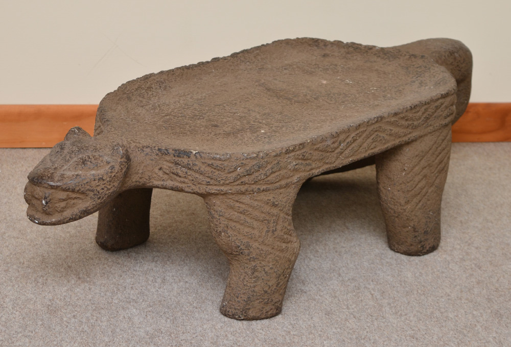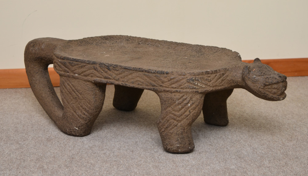 PRE COLUMBIAN JAGUAR EFFIGY GRINDING STONE: Measures approx. 10 3/4'' h. x 38 3/4'' x 15''. Actual age unknown.