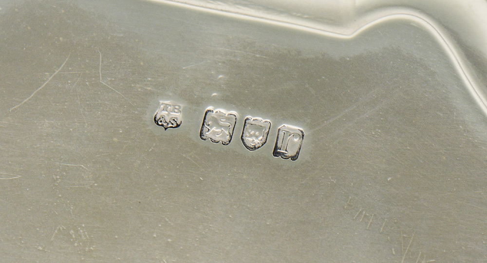 THOMAS BRADBURY & SONS ENGLISH STERLING SALVER: 1912 London hallmark , scalloped rim, on 3 scroll feet, monogrammed, 1 1/2'' h. x 8 1/4''. Approx. 12.8 troy oz.