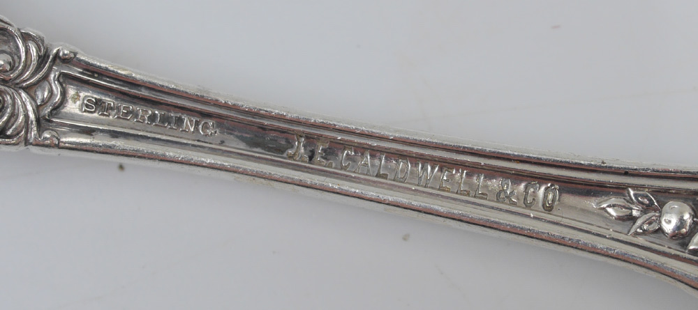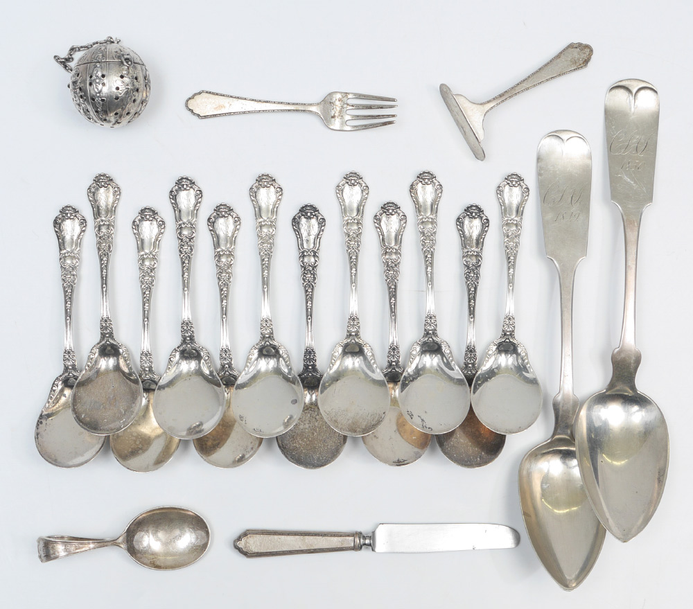 12 GORHAM STERLING BOUILLON SPOONS & MORE: 12 bouillon spoons in the Old Baronial pattern by Gorham, 5'' long, monogrammed. Sold with 3 piece Lunt treasure infant set (fork, knife, pusher), Webster baby spoon, unmarked tea ball, 2 Sands-Reineman Pittsburg coin silver serving spoons monogrammed and dated 1850, 8 3/4''. Approx. 10.2 troy oz sterling, 3 troy oz coin silver.