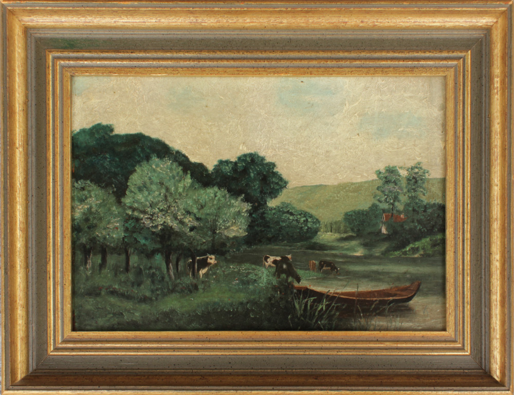 19TH C. NAIVE LANDSCAPE PAINTING WITH COWS: Oil/Wood, 8 1/4'' x 12 1/4'', no visible signature, later frame, 11 1/2'' x 15 3/4''.