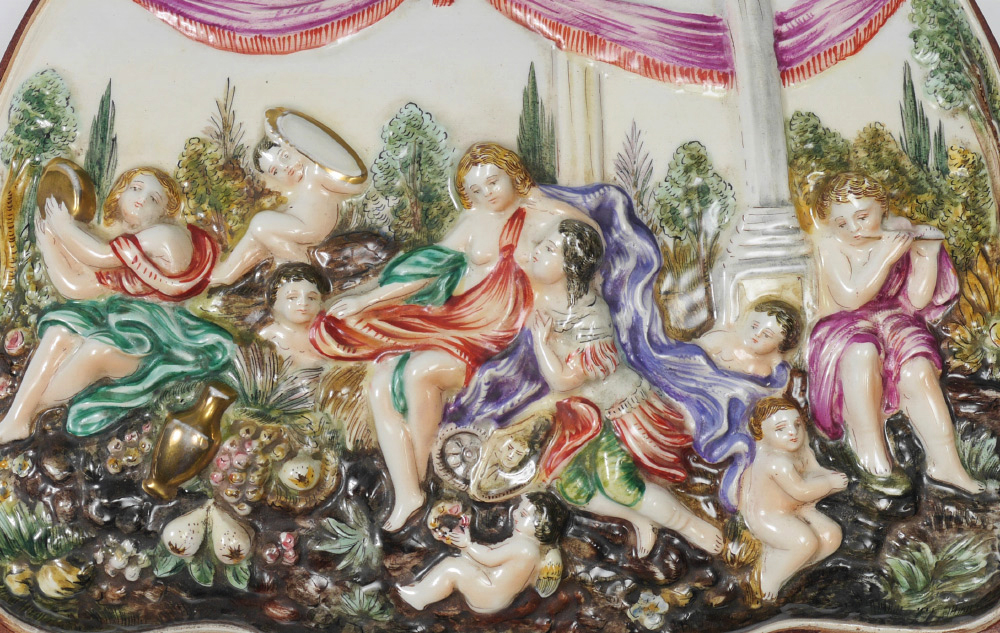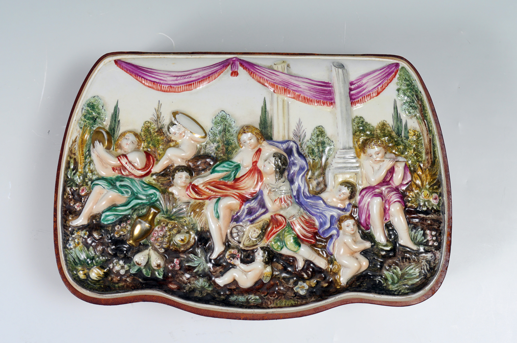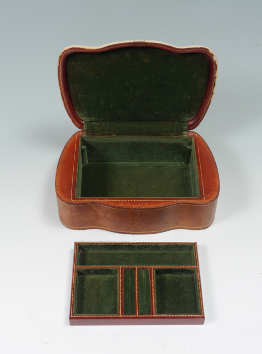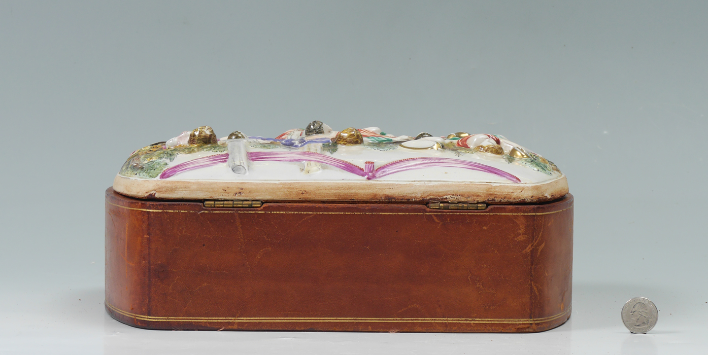 LEATHER CLAD BOX WITH CAPODIMONTE PORCELAIN LID: Hinged lid, lined interior with compartmented lift out tray. 5 1/4'' h. x 13'' x 9''.