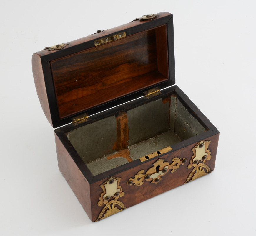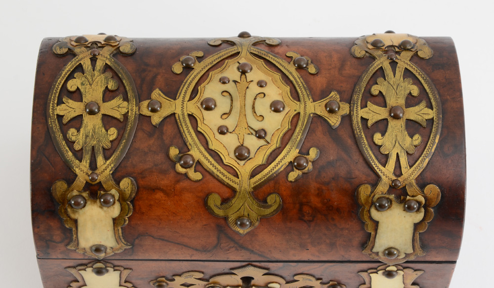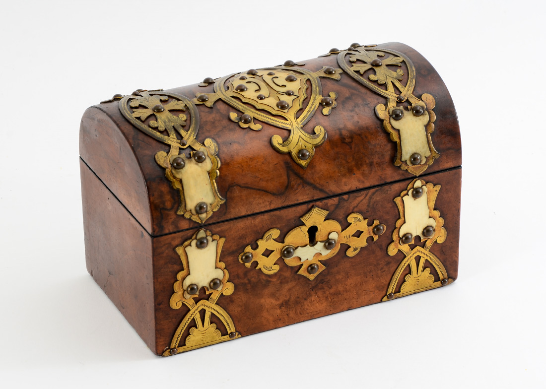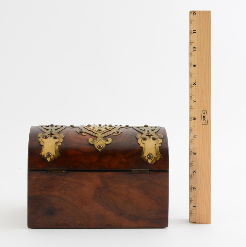 BRASS DECORATED DOMED TEA CADDY: Burl wood box with applied brass and bone decoration, hinged lid, measures 5 1/4'' h. x 8'' x 4 1/4''.