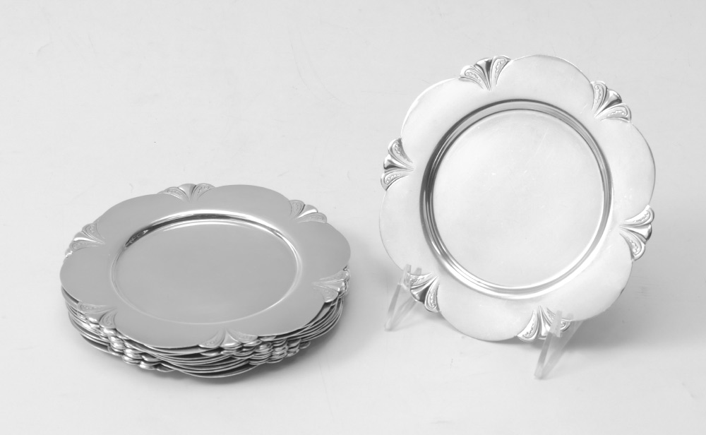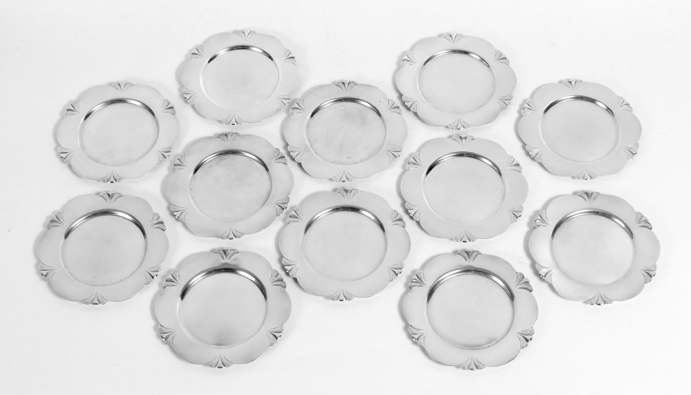 12 STERLING SILVER CAKE PLATES: 6.5'' diameter, marked Sterling, R B each in a shield, and 709. Overall 63.6 troy oz.
