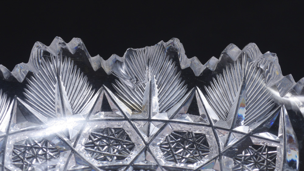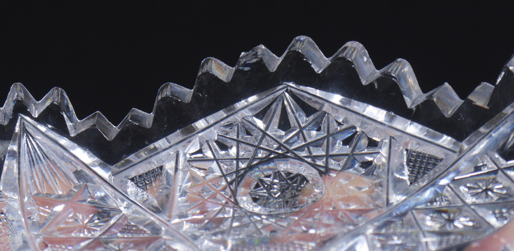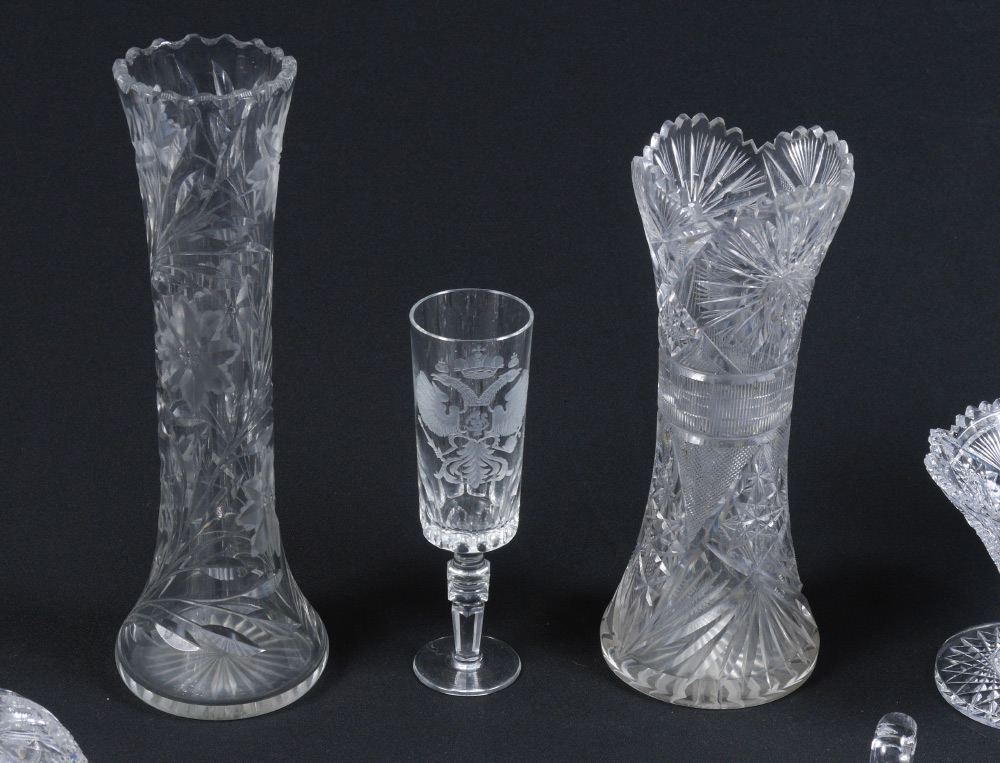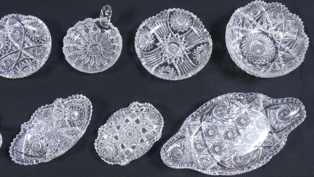 AMERICAN BRILLIANT CUT GLASS: Approx. 14 pieces to include cruet, domed butter, 4 relish trays, 7-14'', and 4 vases, the largest being 13'' tall.