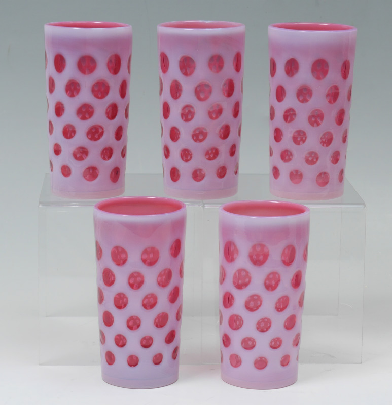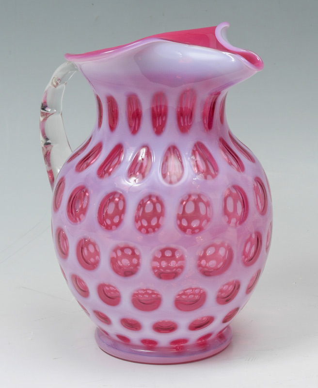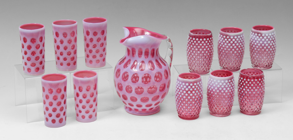 CRANBERRY COIN DOT PITCHER AND GLASSES: 12 piece total, 6 pieces with opalescent coin dot design to include pitcher (9 1/2'' h. x 7 3/4'') and 5 glasses (5 1/4''). Sold with 6 opalescent hobnail glasses (4 3/4'' h. x 3'').