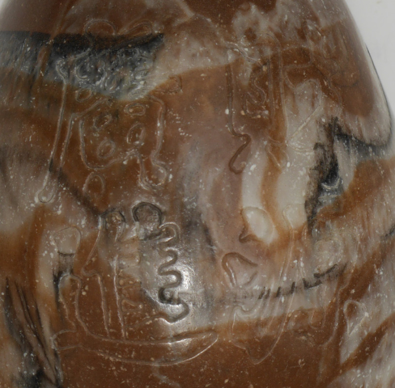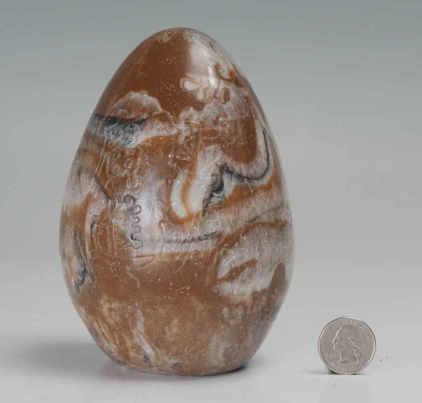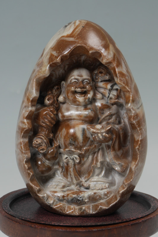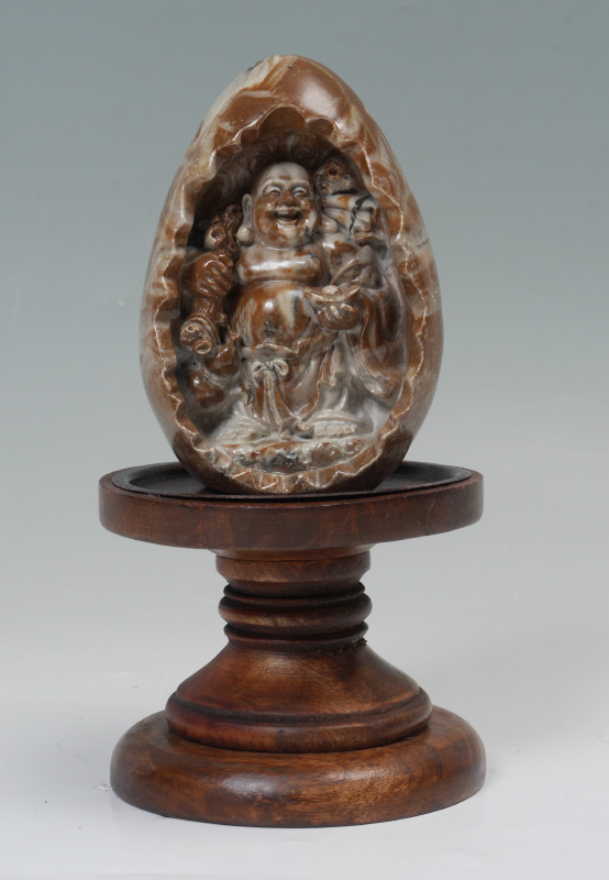 CARVED MARBLE BUDDHA ON STAND: Carved figure of Happy Buddha inside ovoid shape marble, incised mark on back. Measures 5 3/4'' h. x 4 1/4''. Sold with a turned wood stand, 4'' h. x 5'' dia.