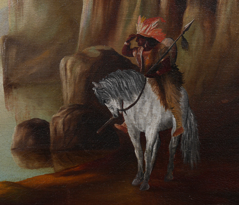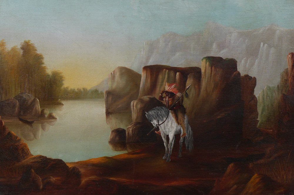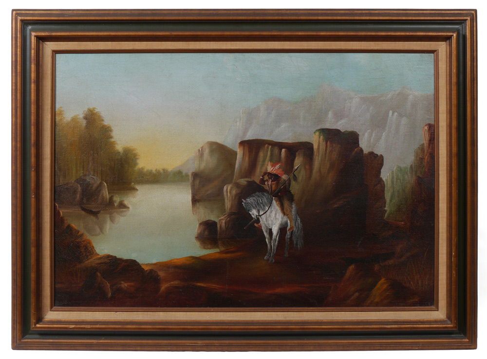 NAIVE NATIVE AMERICAN INDIAN CHIEF ON HORSEBACK: Oil/Canvas, 24'' x 36'', no visible signature, probably a European painting done from a famous picture, as the stretcher is not mitered, and the original canvas appears to be European mattress fabric, framed, 32'' x 43 1/2''.
