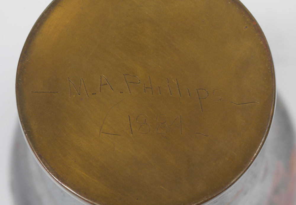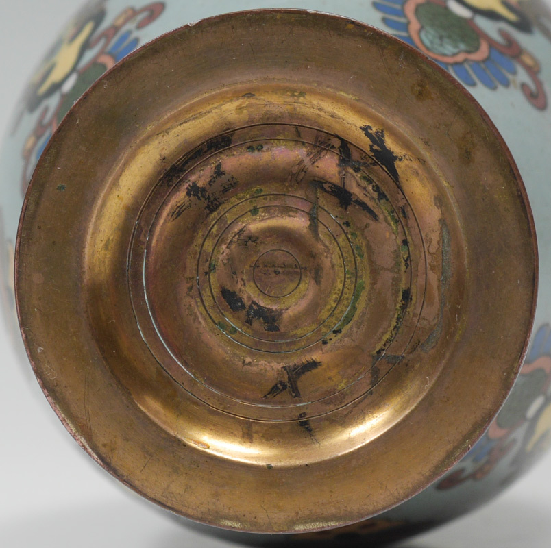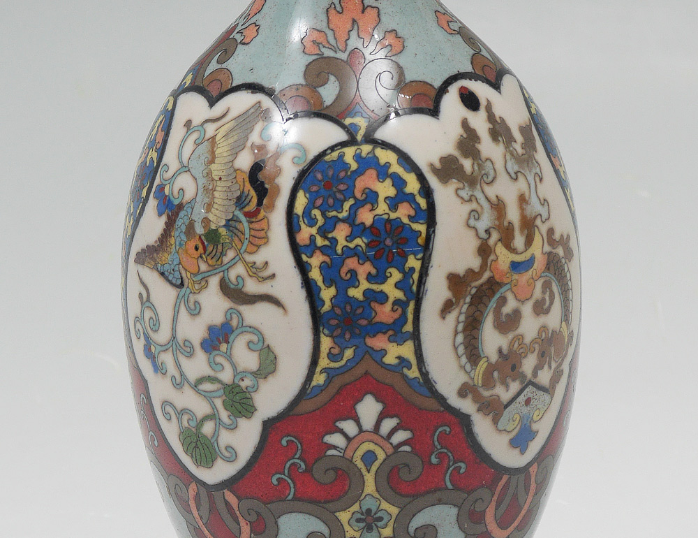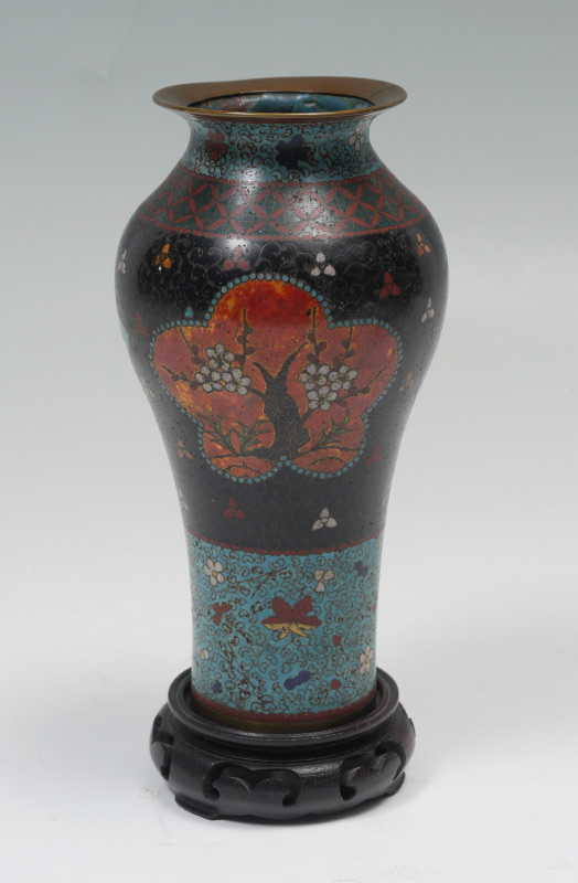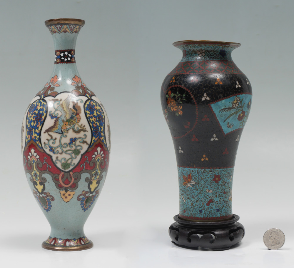 2 ORIENTAL CLOISONNE VASES: 2 pieces total to include 1) Thin neck with light blue ground, decoration to include floral, birds, figural serpents. 9 3/4'' x 4''. 2) Baluster form with dark ground, floral decoration in reserves. Previous owners name and dated 1884 on base. 8'' h. x 4''. Sold with wood stand.