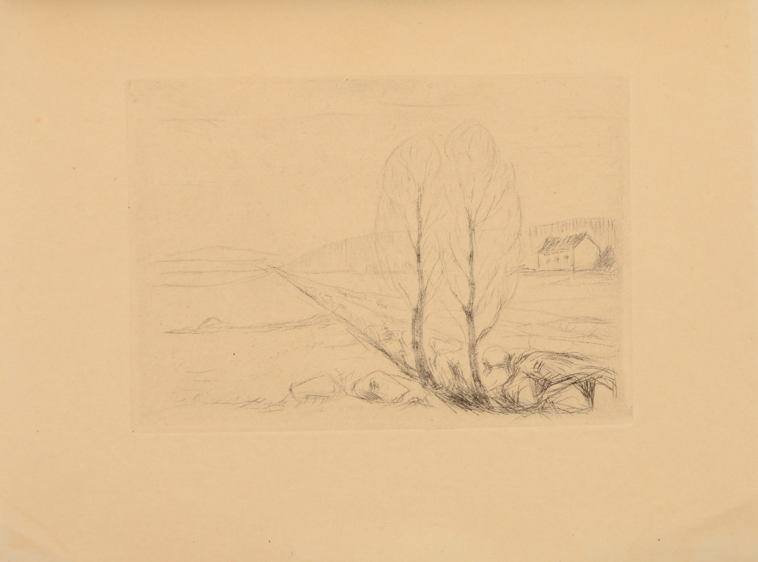 MUNCH, Edvard, (Norwegian, 1863-1944): ''Landschaft'', etching, 4 1/8'' x 5 7/8'''', unframed bookplate with original tissue paper, 7 1/8'' x 9 1/8'' with margins.