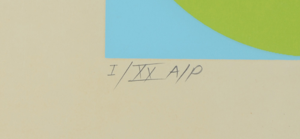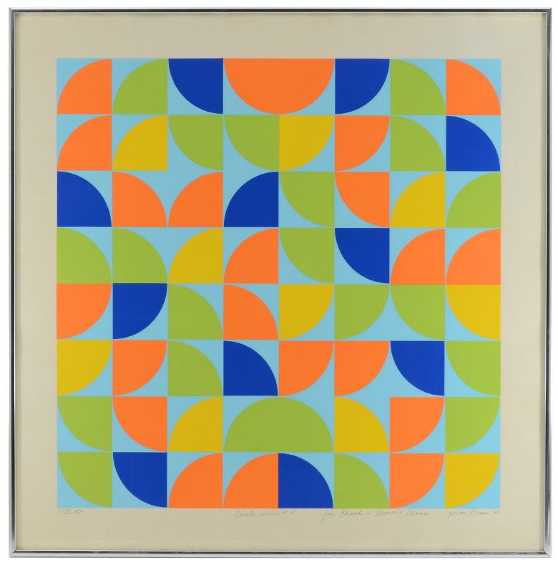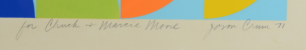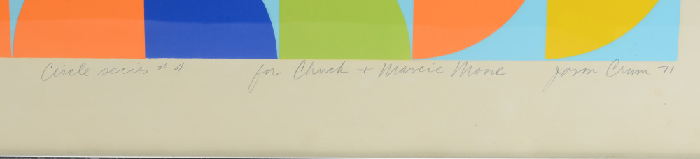 CRUM, Jason, (American, 20th C.): ''Circle Series #4'', Op-Art Composition, Serigraph, sight size 28 1/2'' x 28 1/2'', pencil signed lower right and dated '71, titled, numbered lower left I/XX AP, framed, 29 1/4'' x 29 1/4'', dedicated to Chuck and Marcie Moore.