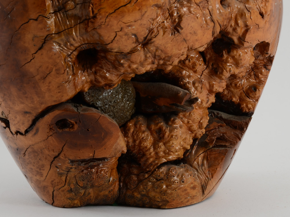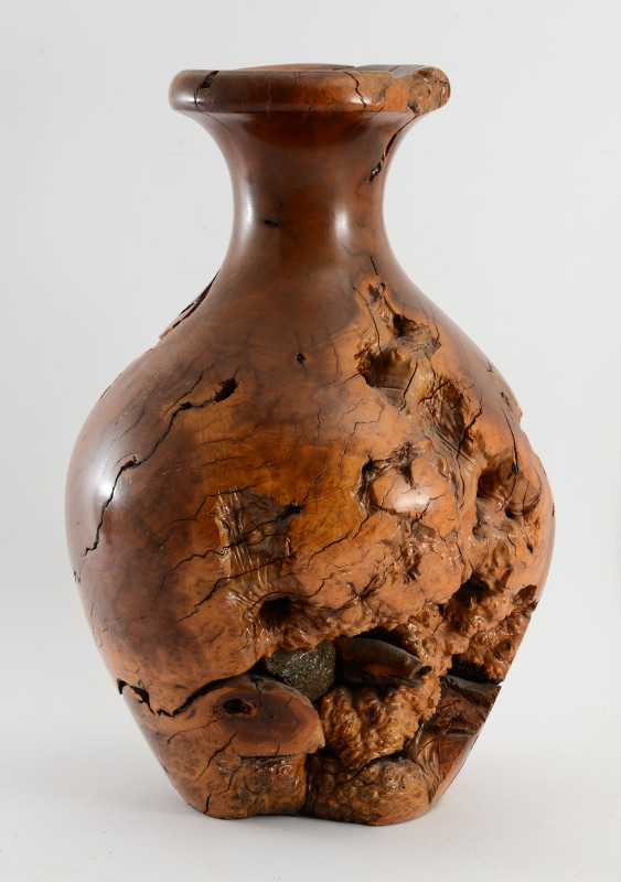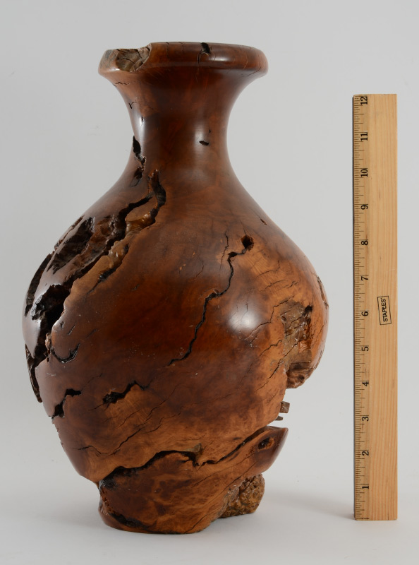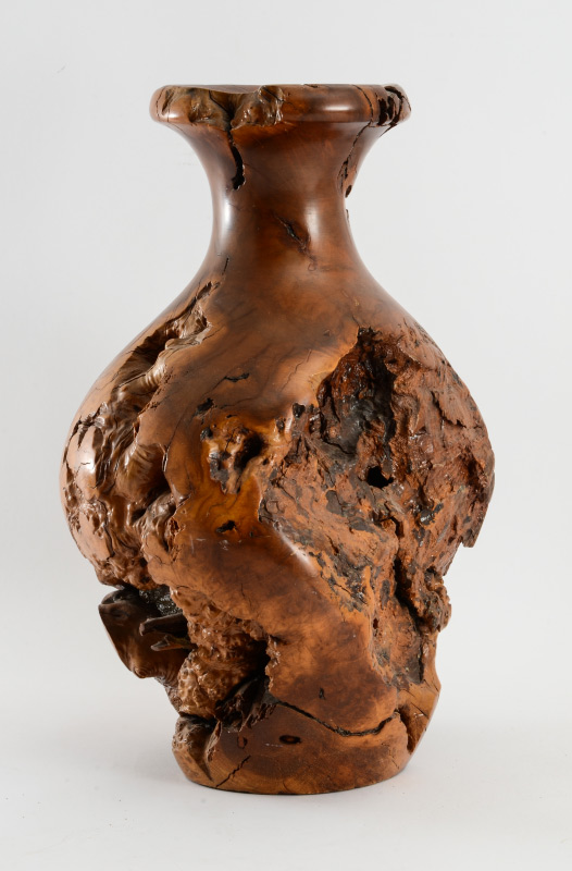 MANZANITA BURL WOOD VASE: Turned manzanita wood vase with flared rim, no visible signature. Overall measures 13 1/2'' h. x 8 1/2''.