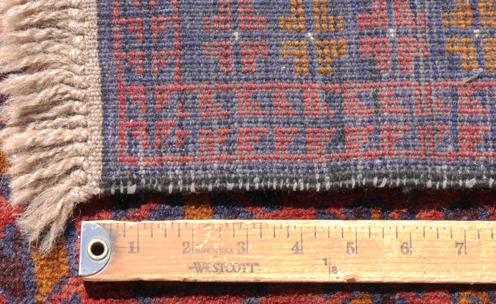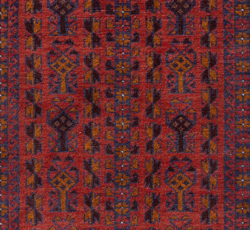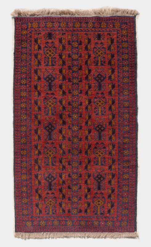 APPROX 20-30 YR OLD AFGHAN BELOUCHI HAND KNOTTED WOOL RUG, 2'7'' x 4'6'': This Belouchi rug has an interesting vertical alignment of the various motifs used in the making of this rug. The rows of geometrically shaped motifs are all done in the same colors of beige, blue, and black on a rust field. The tiny amount of white found in the rug is in keeping with Belouchi weaving. Traditionally the Belouchi have fewer white sheep and that is the reason their rugs have a darker palette. Condition is good.