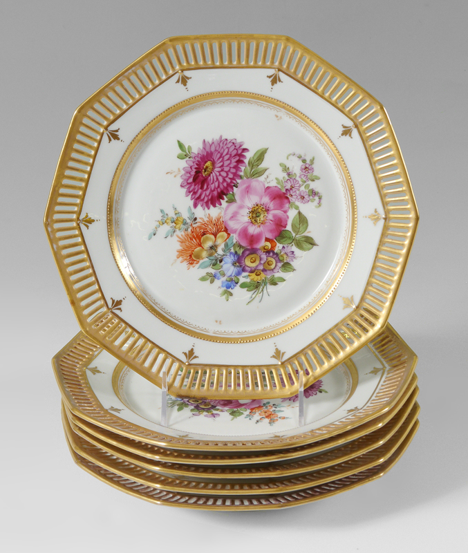 6 A. LAMM DRESDEN RETICULATED PLATES: Hand painted floral motif center, reticulated gilt rim, blue A. Lamm Dresden makers mark on base. 9 7/8'' dia.