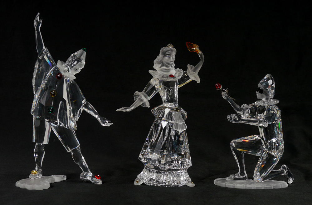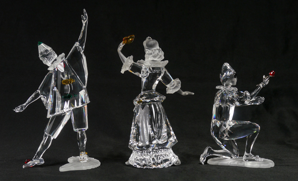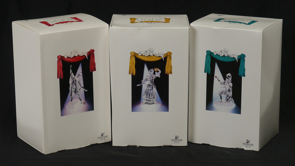 SWAROVSKI CRYSTAL MASQUERADE SERIES: 1) 1999 PIERROT #7400 099 000, Adi Stocker designer, retired Dec 1999. 2) 2000 COLUMBINE #7400 200 000, retired Dec 2000. 3) 2001 HARLEQUIN #7400 200 100, retired Jan 2002.