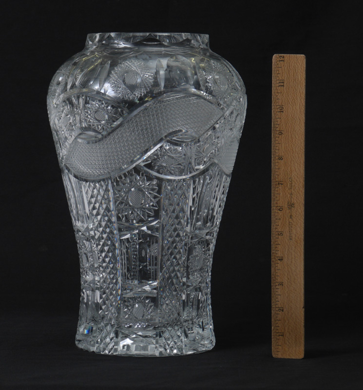 ELEGANT CUT GLASS VASE: A substantial 13'' tall.