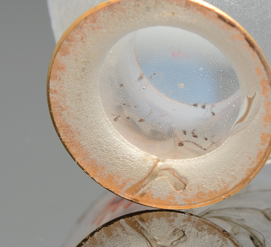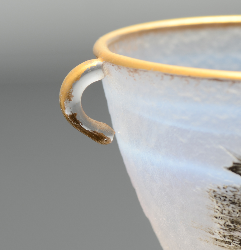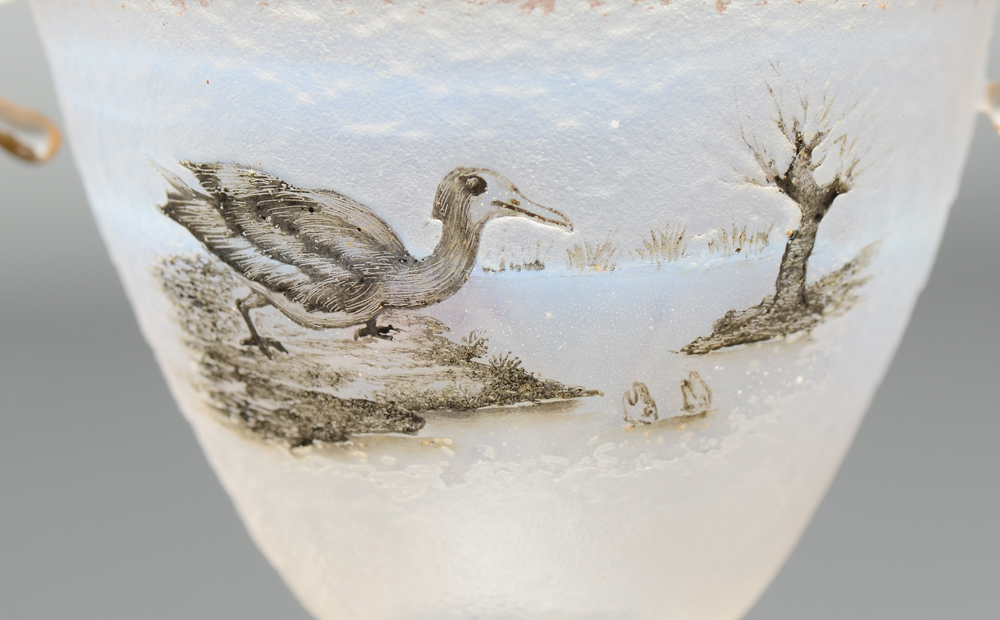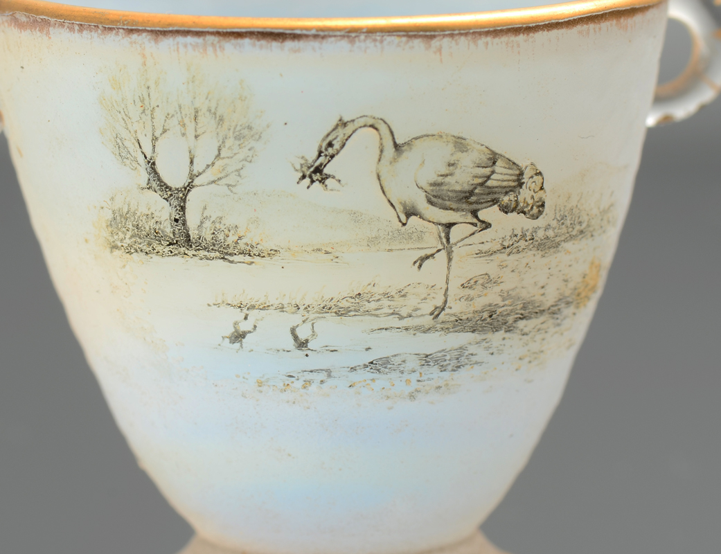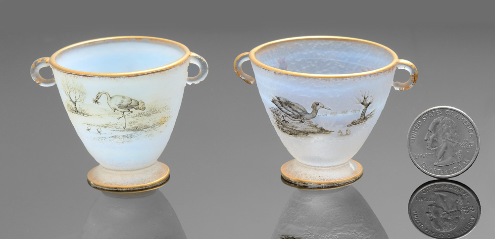 PAIR DIMINUTIVE DAUM NANCY CAMEO GLASS CUPS: One carved with stork and floral motif, the other with duck and floral motif. Each with double handles, gilt trim, signed on base Daum Nancy. 1 1/2'' h. x 2 3/8''.